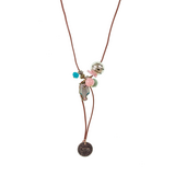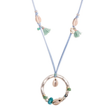Κολιέ από δέρμα με μεταλλικά στοιχεία και φουντάκια, κοχύλια και ματ ακανόνιστος κρίκος με κρύσταλλα ,χάντρες και κοχύλια,σε χρώ