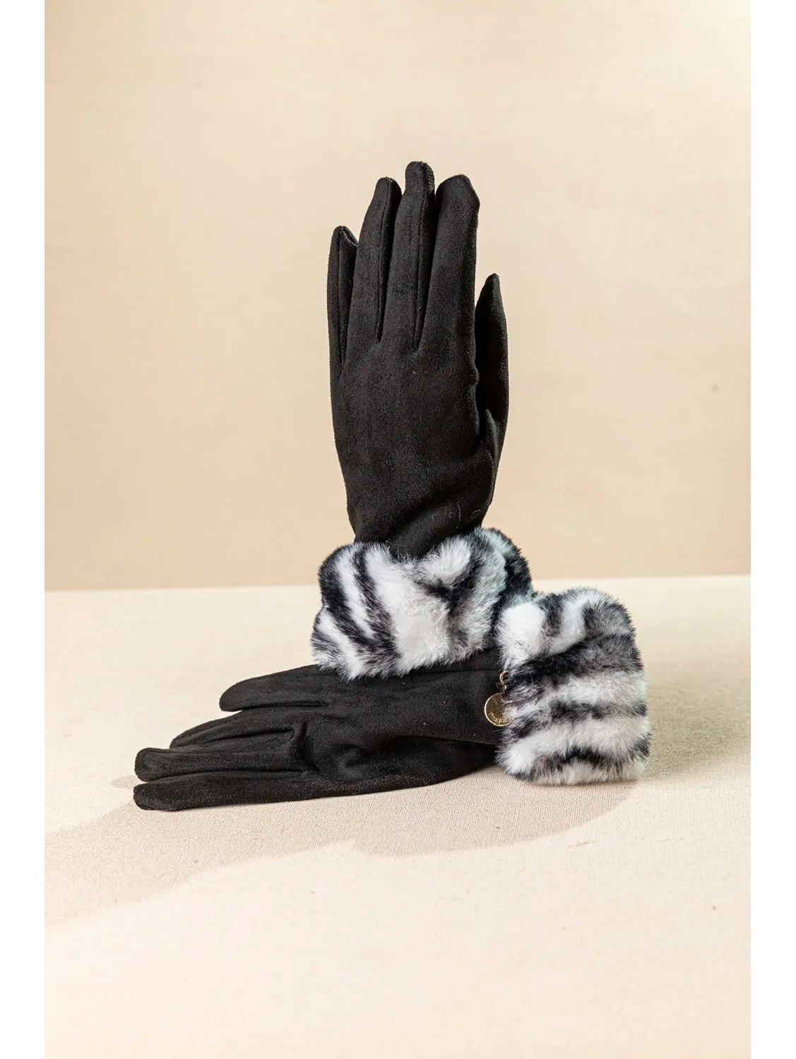 Γάντι γυναικείο, ακρυλικό με βελούδινη αίσθηση και εσωτερική επένδυση. Με ρεβέρ συνθετικής γούνας με animal print. Διαθέτει ειδικό κέντημα για χρήση σε οθόνες αφής στον δείκτη και τον αντίχειρα και των δύο χεριών.