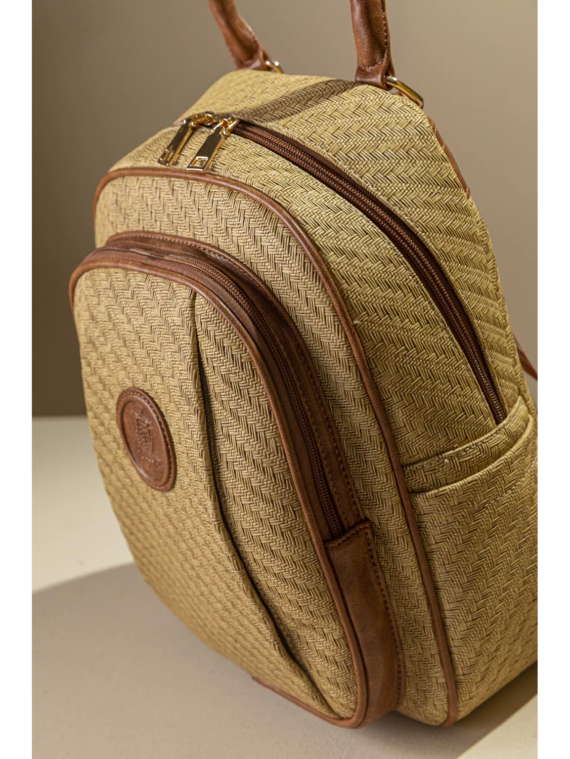 • Αυτό το backpack είναι ο απόλυτος σύμμαχος σας για να βγάλετε μια δύσκολη και απαιτητική μέρα! • Δίχωρο σακίδιο με δυο απολύτως διαχωρισμένες θέσεις που κλείνουν με φερμουάρ. • Το μπροστινό μέρος φέρει δυο κάθετες κρυφές τσέπες που κλείνουν επίσης με φερμουάρ. • Στον εσωτερικό χώρο βρίσκουμε τα βοηθητικά τσεπάκια και εξωτερική βοηθητική τσέπη με φερμουάρ. Στα πλαϊνά της τσάντας θα βρείτε δύο τσεπάκια για μικροαντικείμενα ή τα εισιτήρια σας. • Τα χεράκια των ώμων είναι δερματίνη με ιμάντα για μεγαλύτερη άνεση. Υλικό: Μαλακό συνθετικό δέρμα ανάγλυφης υφής με το logo της εταιρείας ή με υφή ψάθας σε γήινες αποχρώσεις.