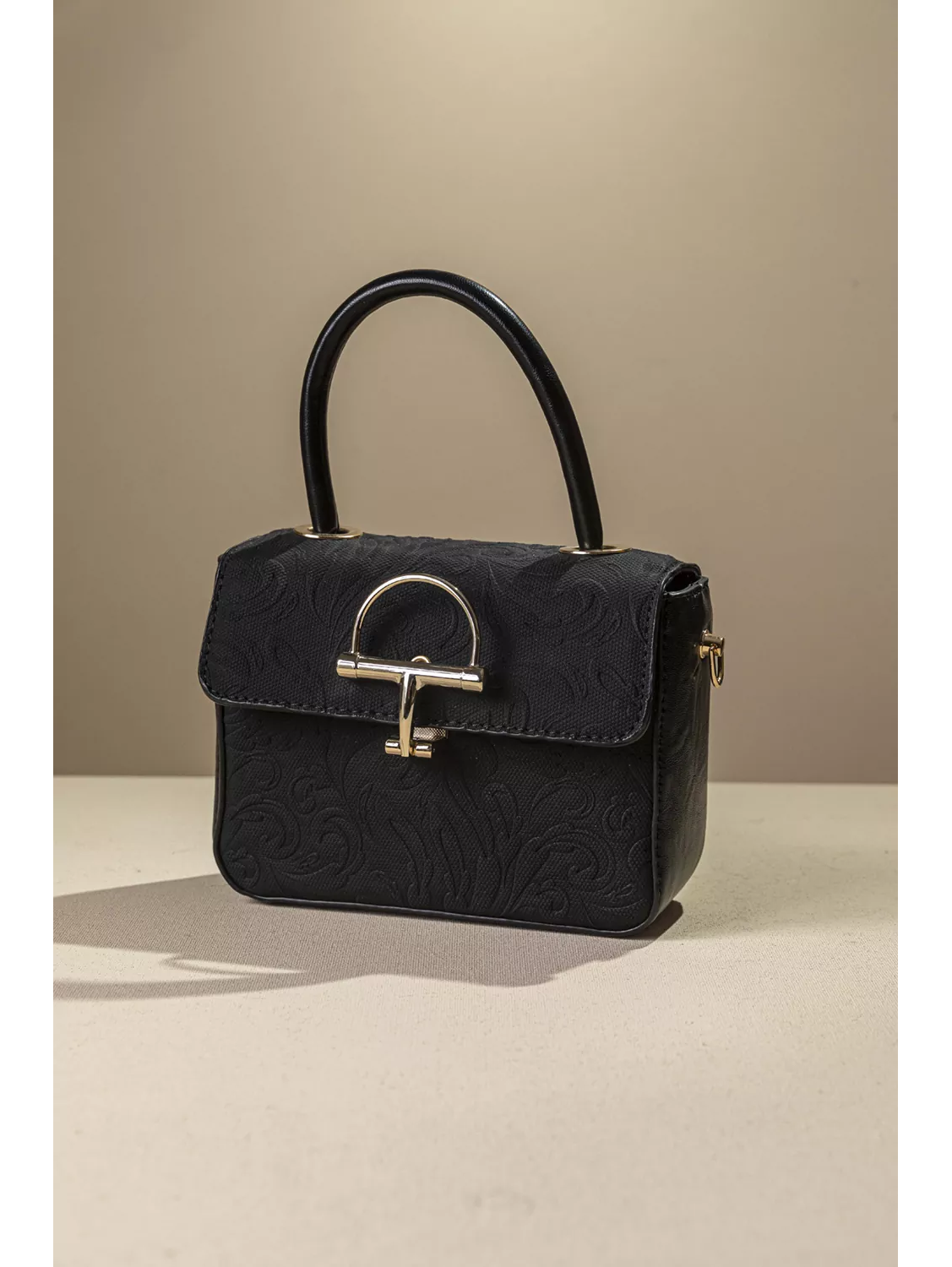 • Διαθέτει εντυπωσιακό μεταλλικό κούμπωμα σε χρυσό τόνο. Εκτός από το κοντό σταθερό χέρι περιλαμβάνει μακρύ χέρι για χιαστί κράτημα.