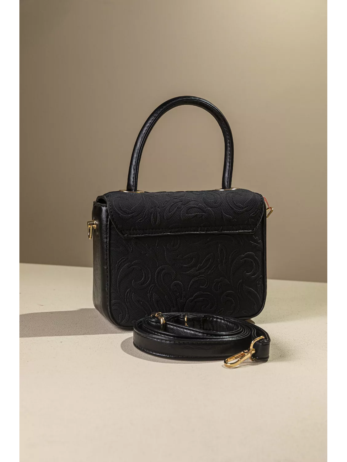 • Κομψή τσάντα χειρός με υφασμάτινη ανάγλυφη υφή και λεπτομέρειες συνθετικού δέρματος.