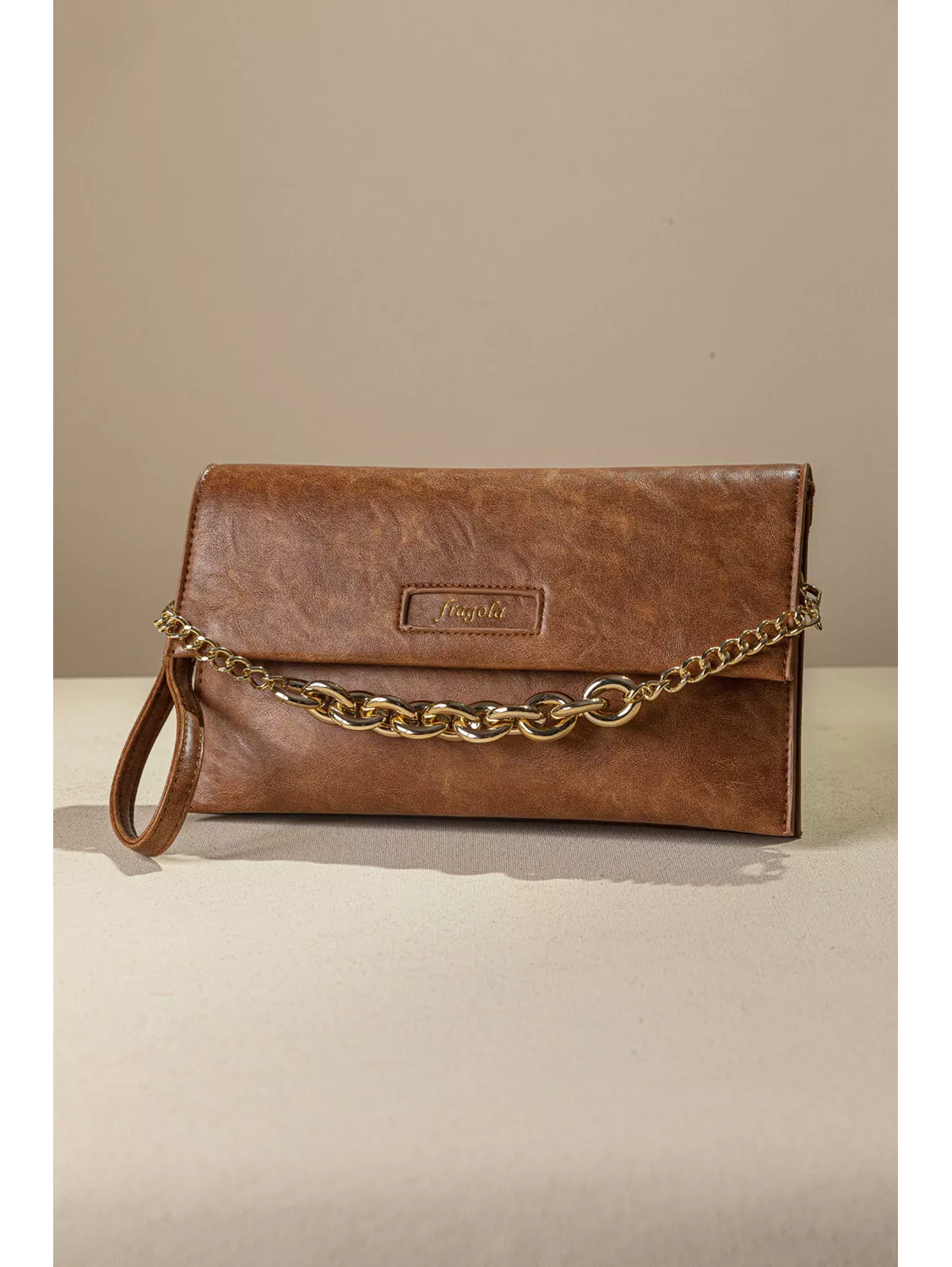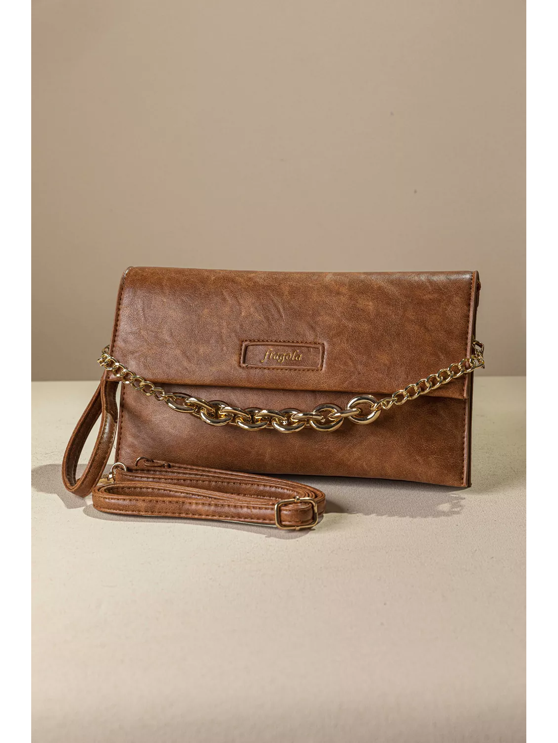 • Διθέσιος φάκελος με ιδιαίτερη υφή δέρματος που ταιριάζει εύκολα σε κάθε εμφάνιση, από πρωινή έως βραδινή. • Η εντυπωσιακή χρυσή αλυσίδα στο μπροστινό μέρος λειτουργεί ως διακοσμητικό στοιχείο προσθέτοντας μια πινελιά πολυτέλειας και στυλ. • Διαθέτει χειρολαβή και πρακτικό χέρι για χιαστί κράτημα. Ιδανική επιλογή για γυναίκες που αναζητούν διαχρονική κομψότητα με μοντέρνες λεπτομέρειες. Υλικό: Μαλακό συνθετικό δέρμα με παλαιωμένη όψη.