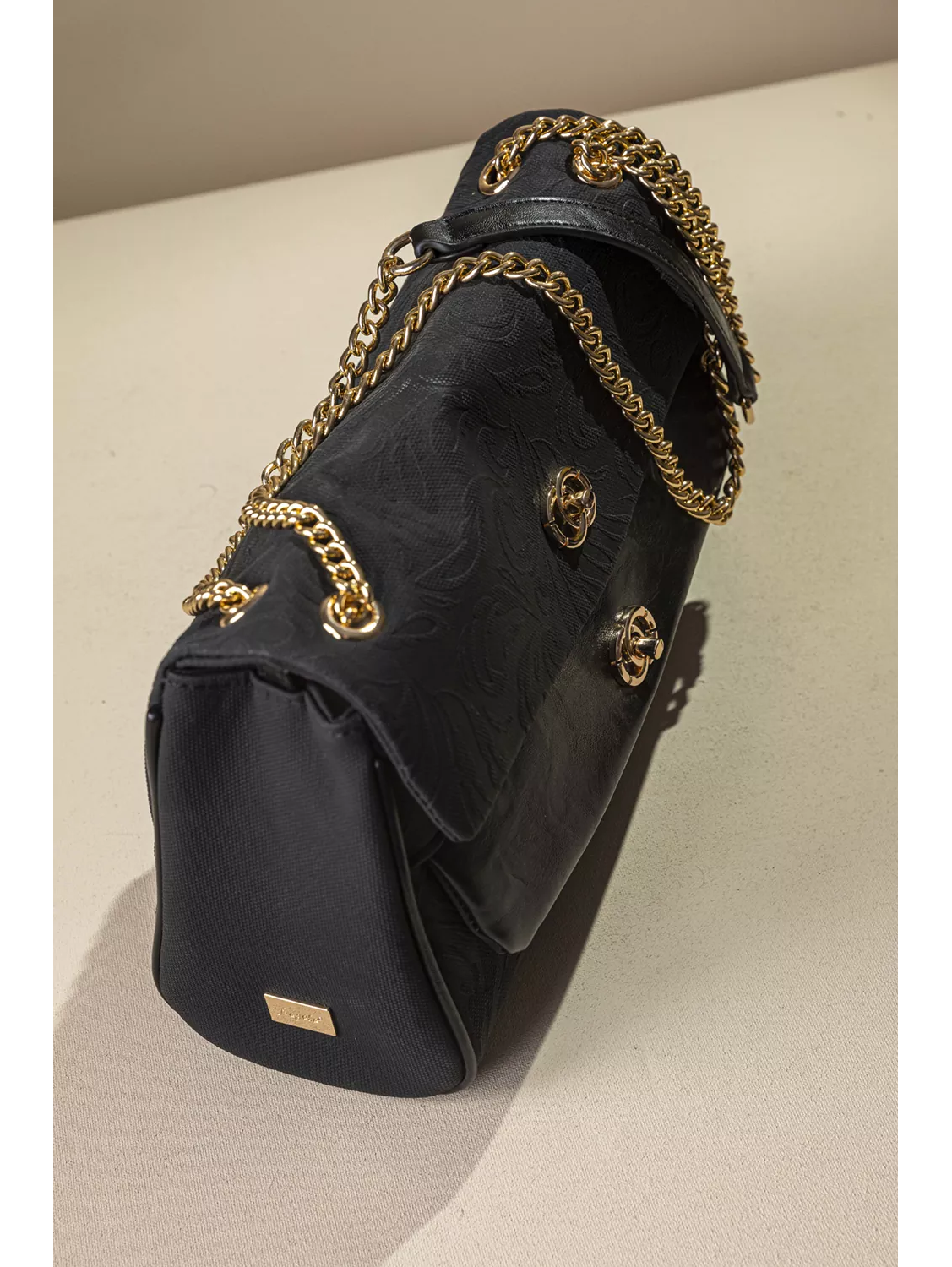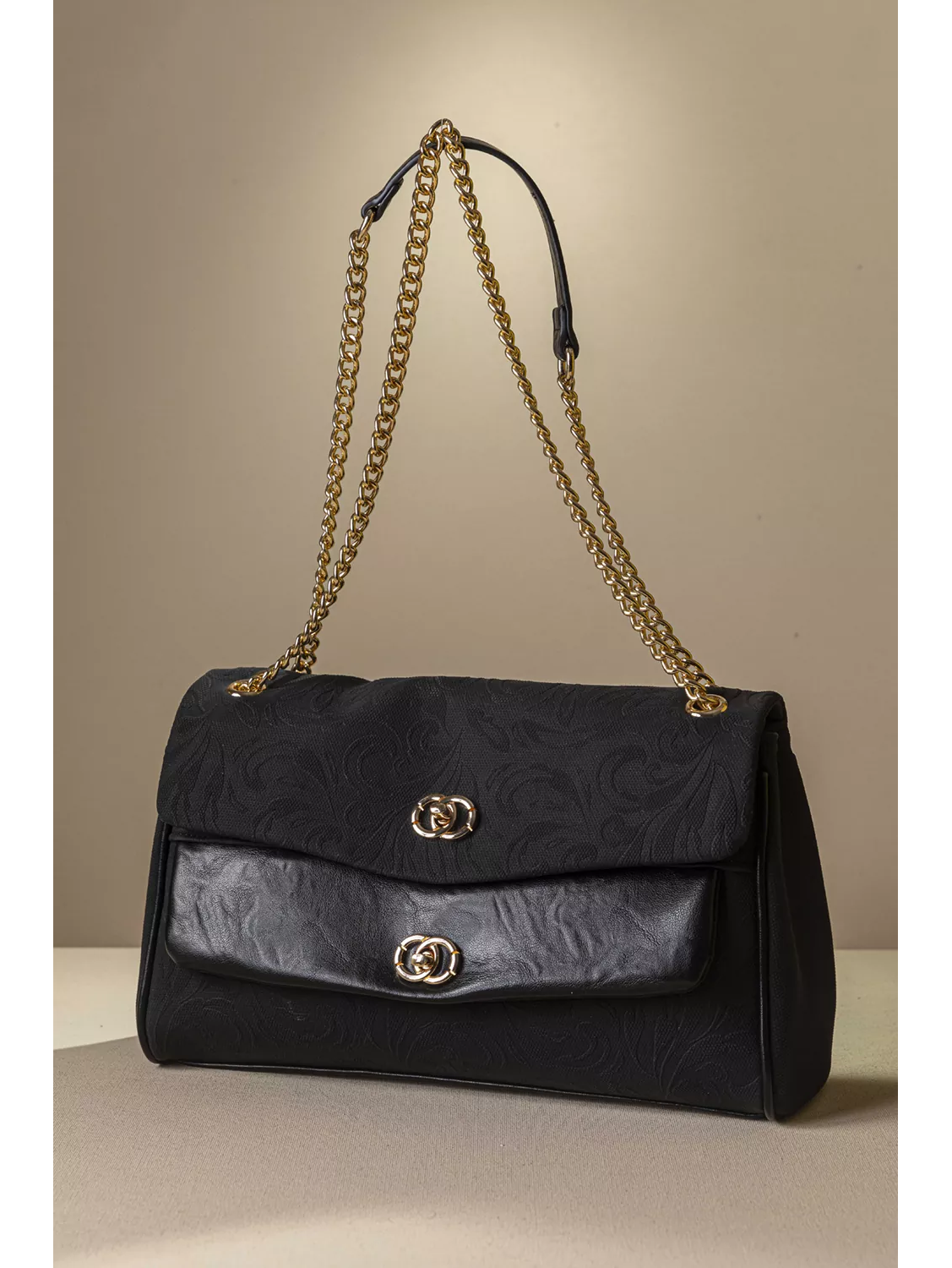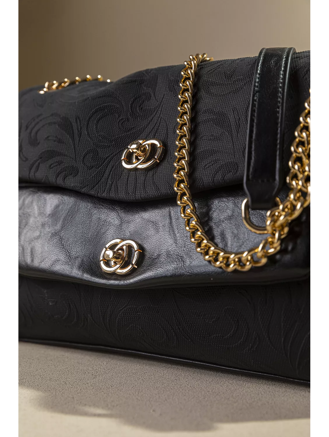 • Κομψή και διαχρονική γυναικεία τσάντα ώμου, ιδανική για όλες τις ώρες. • Ευρύχωρο εσωτερικό που καλύπτει τις καθημερινές σας ανάγκες, χωρισμένο σε τρία μέρη με διαχωριστικό φερμουάρ. • Διαθέτει χρυσή μεταλλική αλυσίδα που φοριέται στον ώμο ή χιαστί καθώς και μεταλλικά κλίπς για ασφαλές κλείσιμο στα δυο καπάκια της. Υλικό: Συνθετικό δέρμα με υφή canva και εντυπωσιακό ανάγλυφο print.