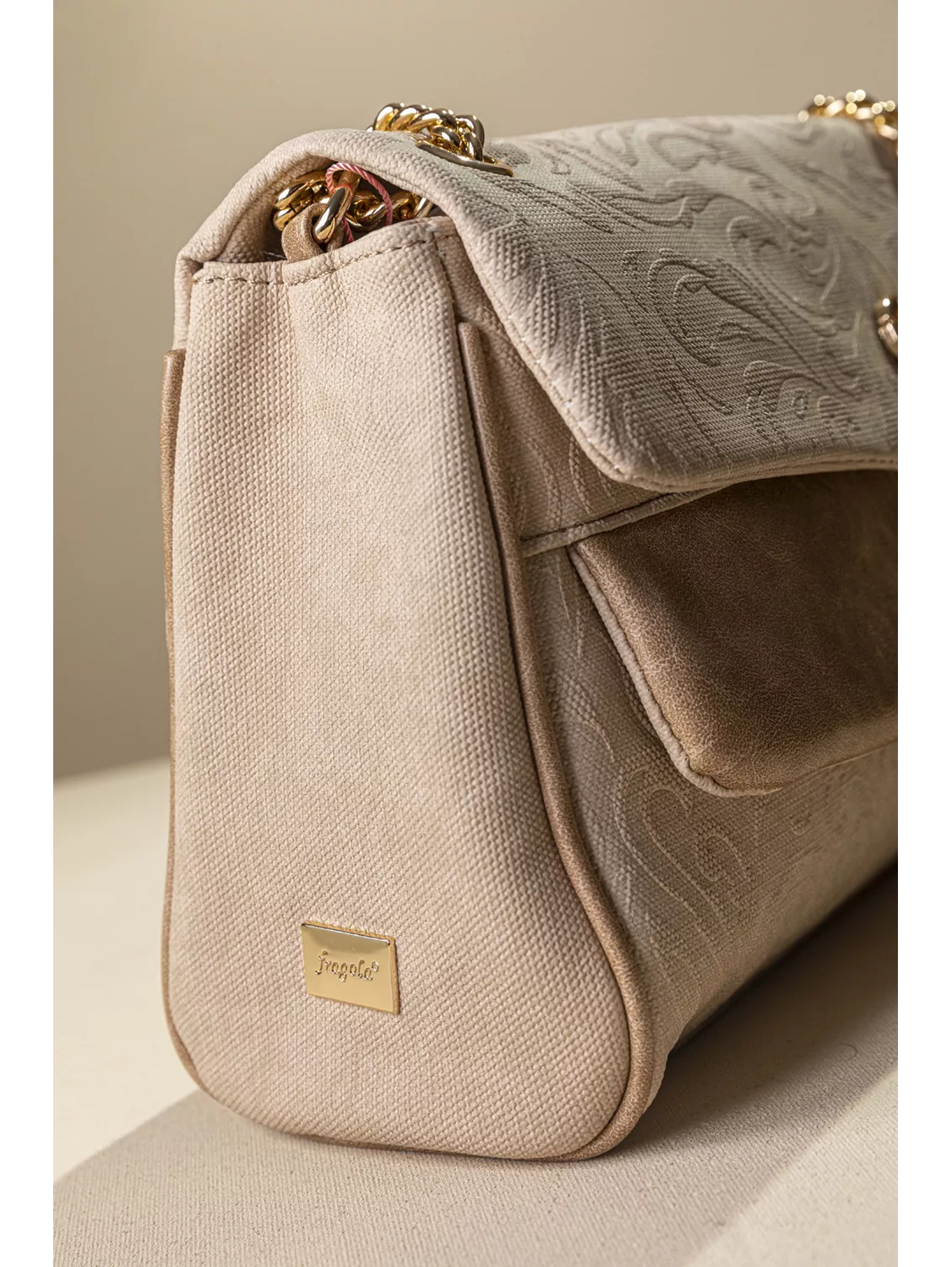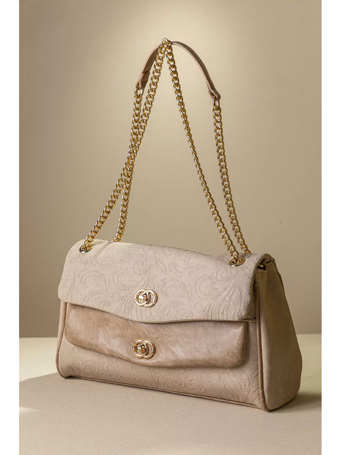 • Κομψή και διαχρονική γυναικεία τσάντα ώμου, ιδανική για όλες τις ώρες. • Ευρύχωρο εσωτερικό που καλύπτει τις καθημερινές σας ανάγκες, χωρισμένο σε τρία μέρη με διαχωριστικό φερμουάρ. • Διαθέτει χρυσή μεταλλική αλυσίδα που φοριέται στον ώμο ή χιαστί καθώς και μεταλλικά κλίπς για ασφαλές κλείσιμο στα δυο καπάκια της. Υλικό: Συνθετικό δέρμα με υφή canva και εντυπωσιακό ανάγλυφο print.