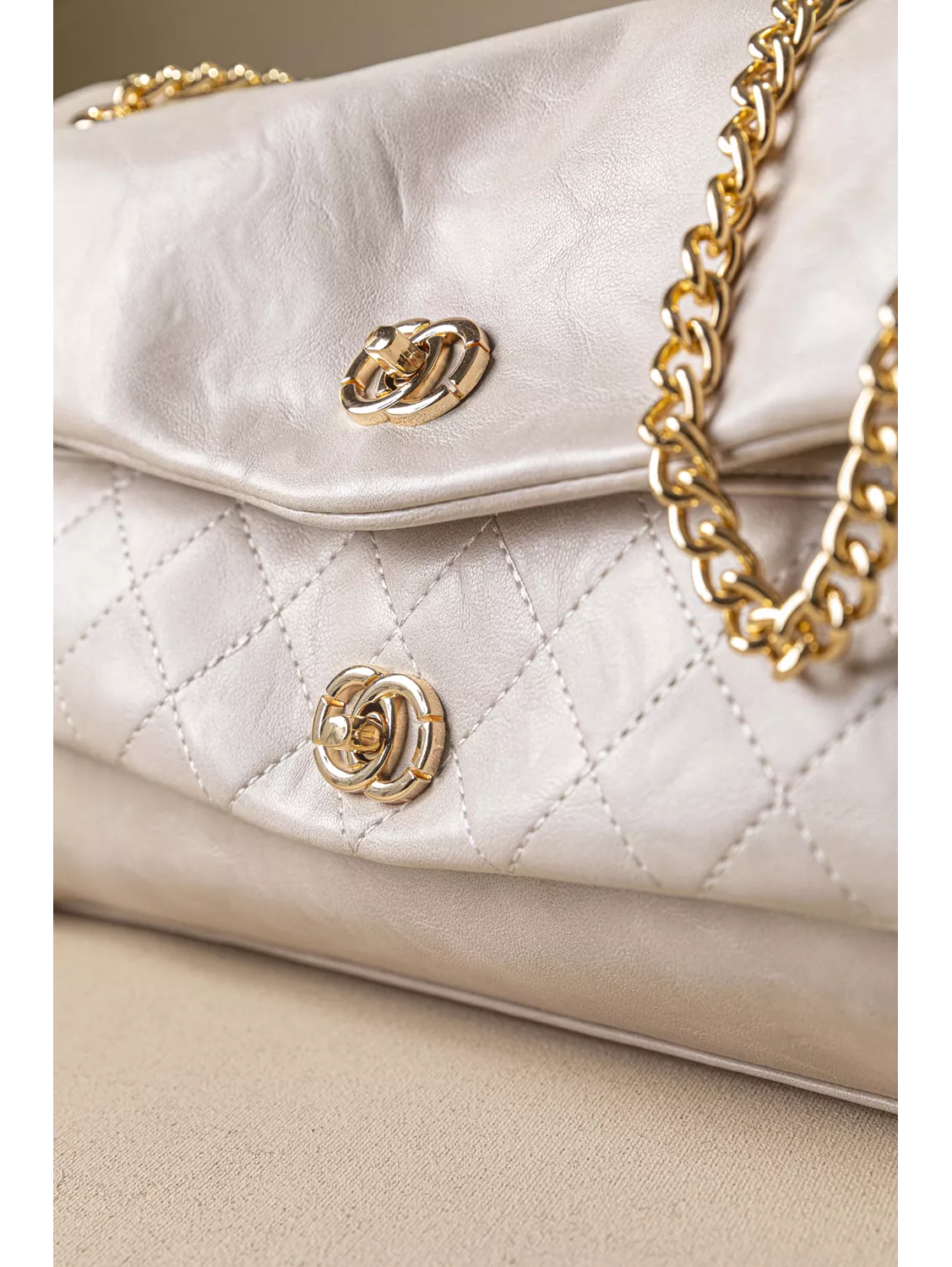 • Διαθέτει χρυσή μεταλλική αλυσίδα που φοριέται στον ώμο ή χιαστί καθώς και μεταλλικά κλίπς για ασφαλές κλείσιμο στα δυο καπάκια της.