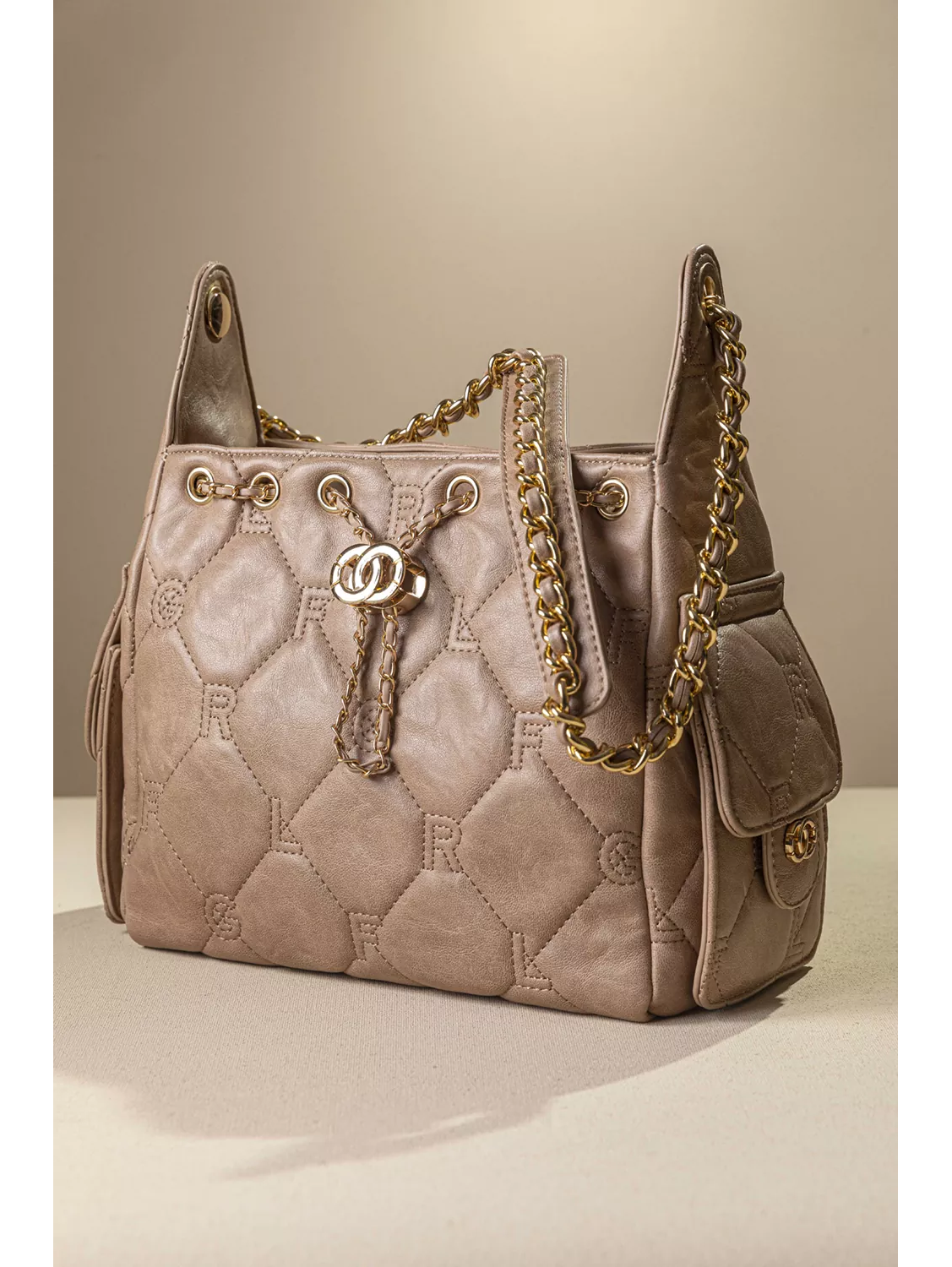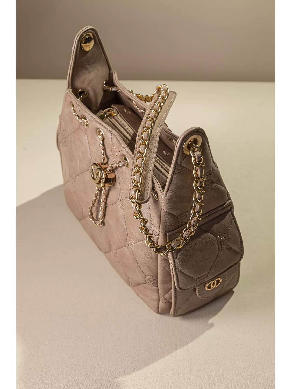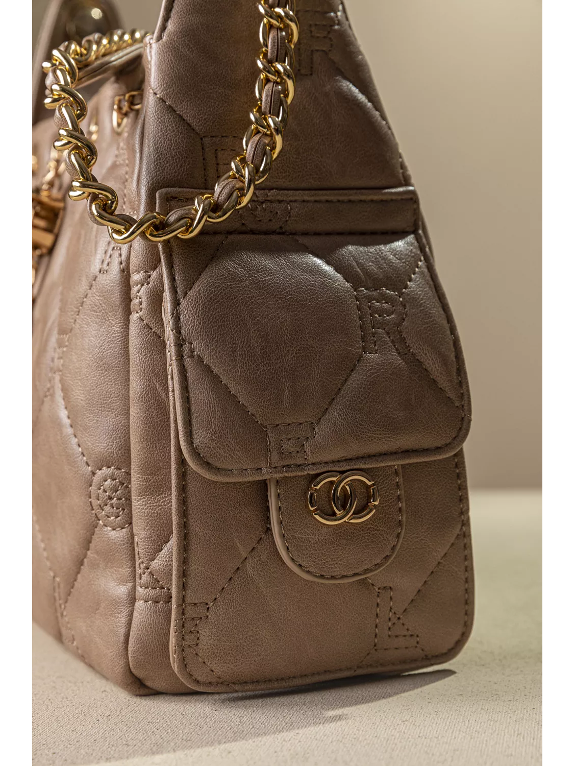 • Γυναικεία τσάντα ώμου κατασκευασμένη από μαλακό συνθετικό δέρμα με παλαιωμένη όψη και καπιτονέ γαζιά που απεικονίζουν τα γράμματα της εταιρείας.