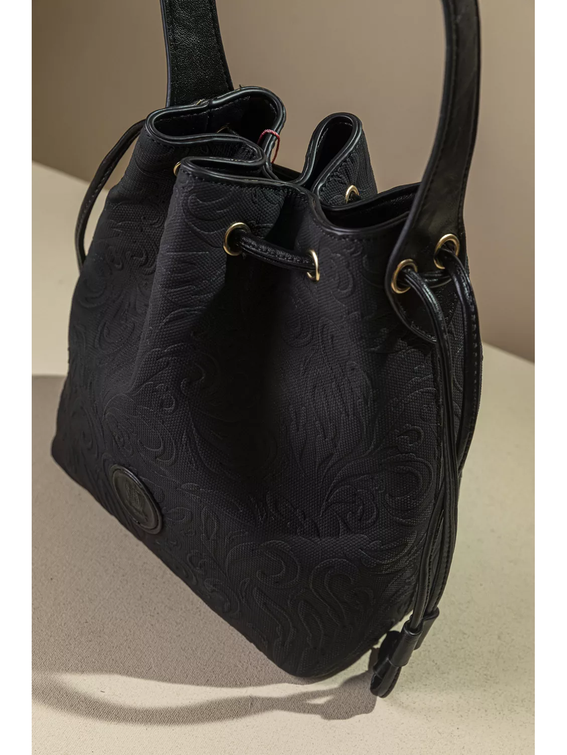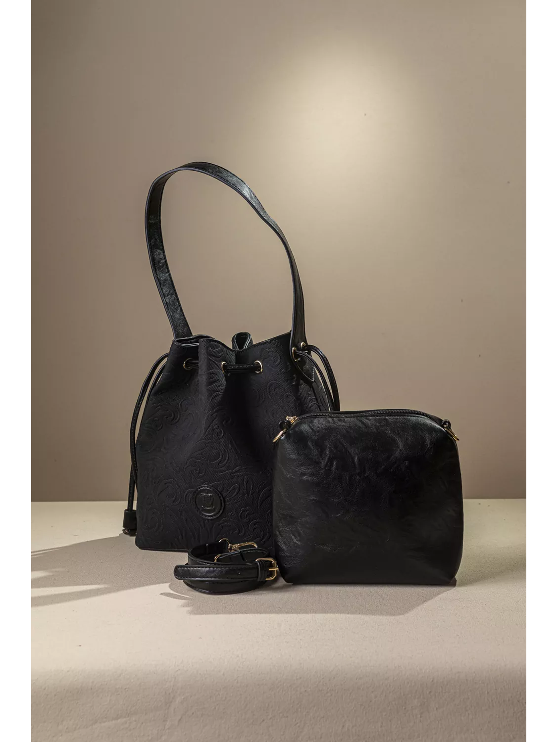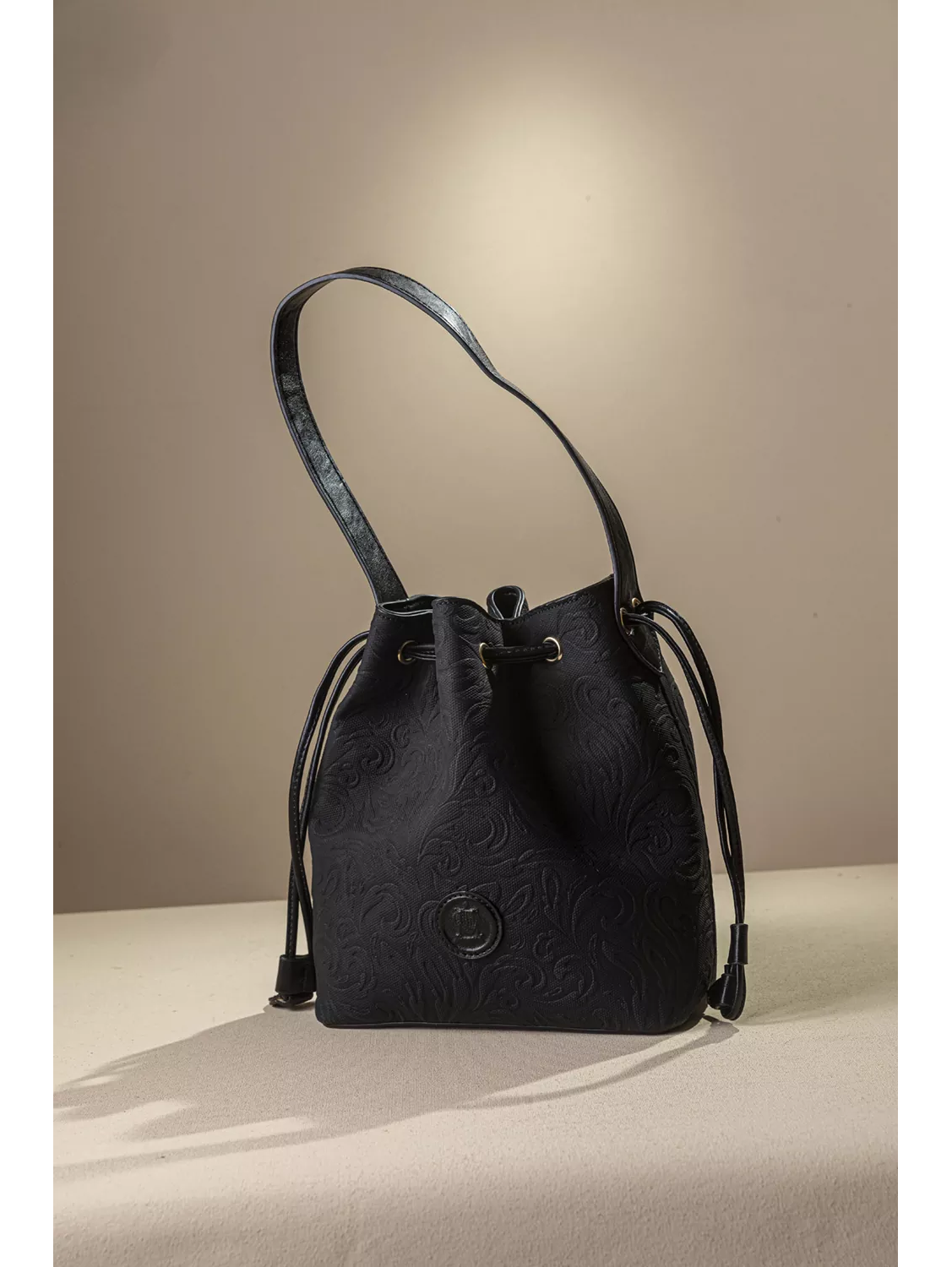 • Κομψή γυναικεία τσάντα-πουγκί με διαχρονικό και εκλεπτυσμένο χαρακτήρα. Αποτελεί ιδανική επιλογή για καθημερινές αλλά και πιο προσεγμένες εμφανίσεις. • Κλείνει με κορδόνι για εύκολη και γρήγορα πρόσβαση στο εσωτερικό, ενώ διαθέτει φαρδύ λουρί ώμου για άνετη εφαρμογή. • Το διακριτικό λογότυπο στο μπροστινό μέρος ολοκληρώνει το κομψό design. • Περιλαμβάνει ένθετο μικρό τσαντάκι με extra χέρι που του επιτρέπει να κρατηθεί ως χιαστί. • Ελαφριά, πρακτική και ευρύχωρη, συνδυάζεται εύκολα με κάθε outfit. Υλικό: Συνθετικό δέρμα με υφή canva και εντυπωσιακό ανάγλυφο print ή Συνθετικό δέρμα με τη μορφή ψάθας σε γήινα χρώματα.