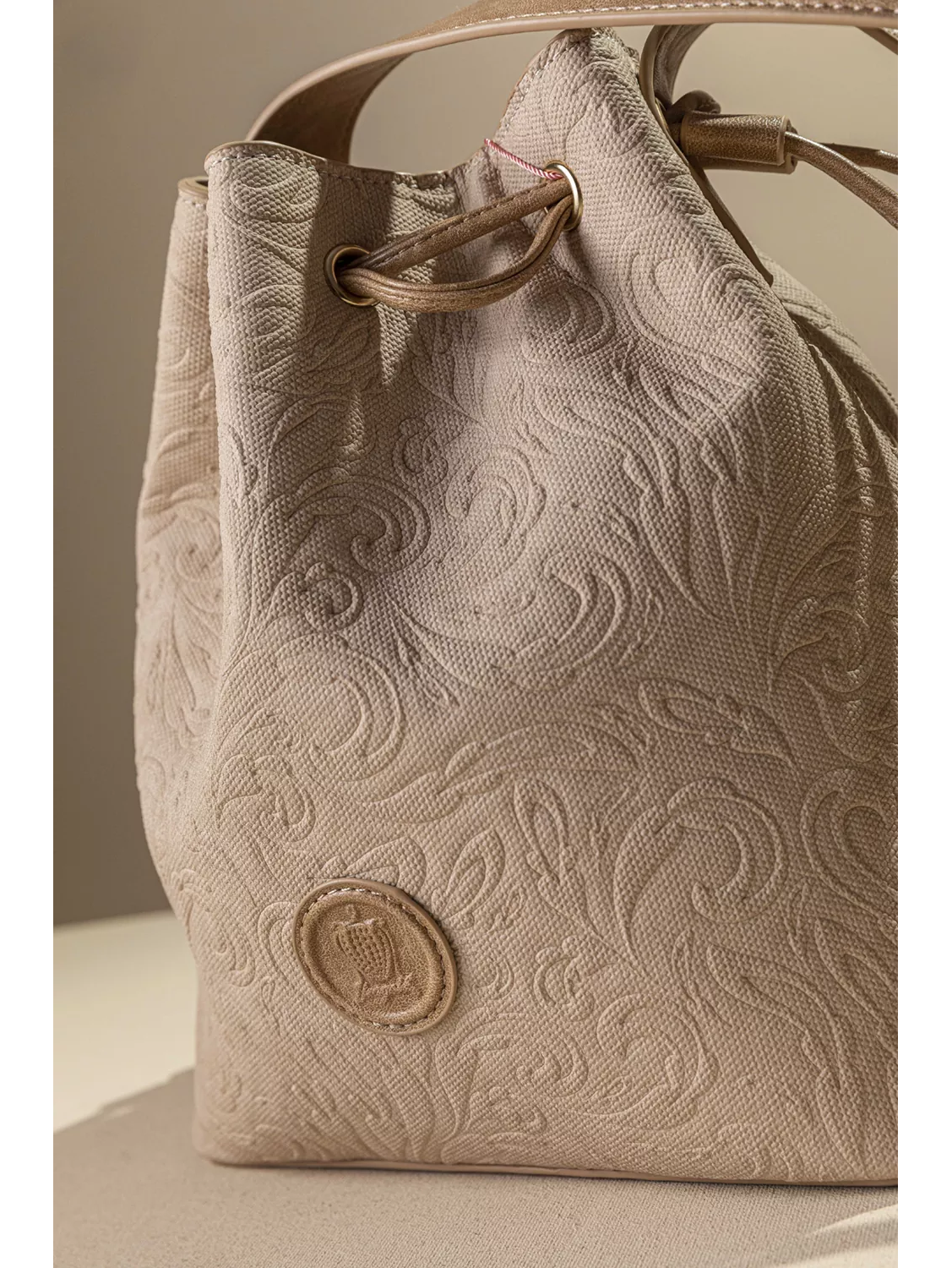 • Κομψή γυναικεία τσάντα-πουγκί με διαχρονικό και εκλεπτυσμένο χαρακτήρα. Αποτελεί ιδανική επιλογή για καθημερινές αλλά και πιο προσεγμένες εμφανίσεις. • Κλείνει με κορδόνι για εύκολη και γρήγορα πρόσβαση στο εσωτερικό, ενώ διαθέτει φαρδύ λουρί ώμου για άνετη εφαρμογή. • Το διακριτικό λογότυπο στο μπροστινό μέρος ολοκληρώνει το κομψό design. • Περιλαμβάνει ένθετο μικρό τσαντάκι με extra χέρι που του επιτρέπει να κρατηθεί ως χιαστί. • Ελαφριά, πρακτική και ευρύχωρη, συνδυάζεται εύκολα με κάθε outfit. Υλικό: Συνθετικό δέρμα με υφή canva και εντυπωσιακό ανάγλυφο print ή Συνθετικό δέρμα με τη μορφή ψάθας σε γήινα χρώματα.