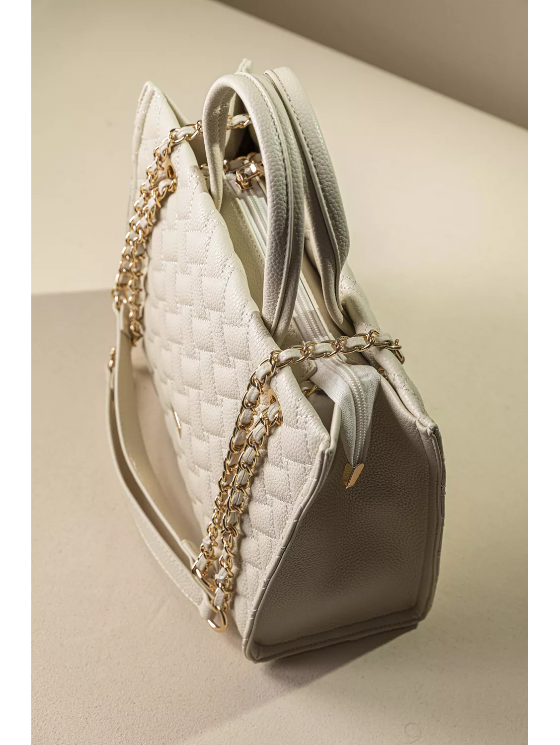 • Μια τσάντα που δείχνει σοβαρή αλλά έχει άποψη, καπιτονέ σχέδιο, μαλακή υφή και χρυσή αλυσίδα που κάνει "θόρυβο".