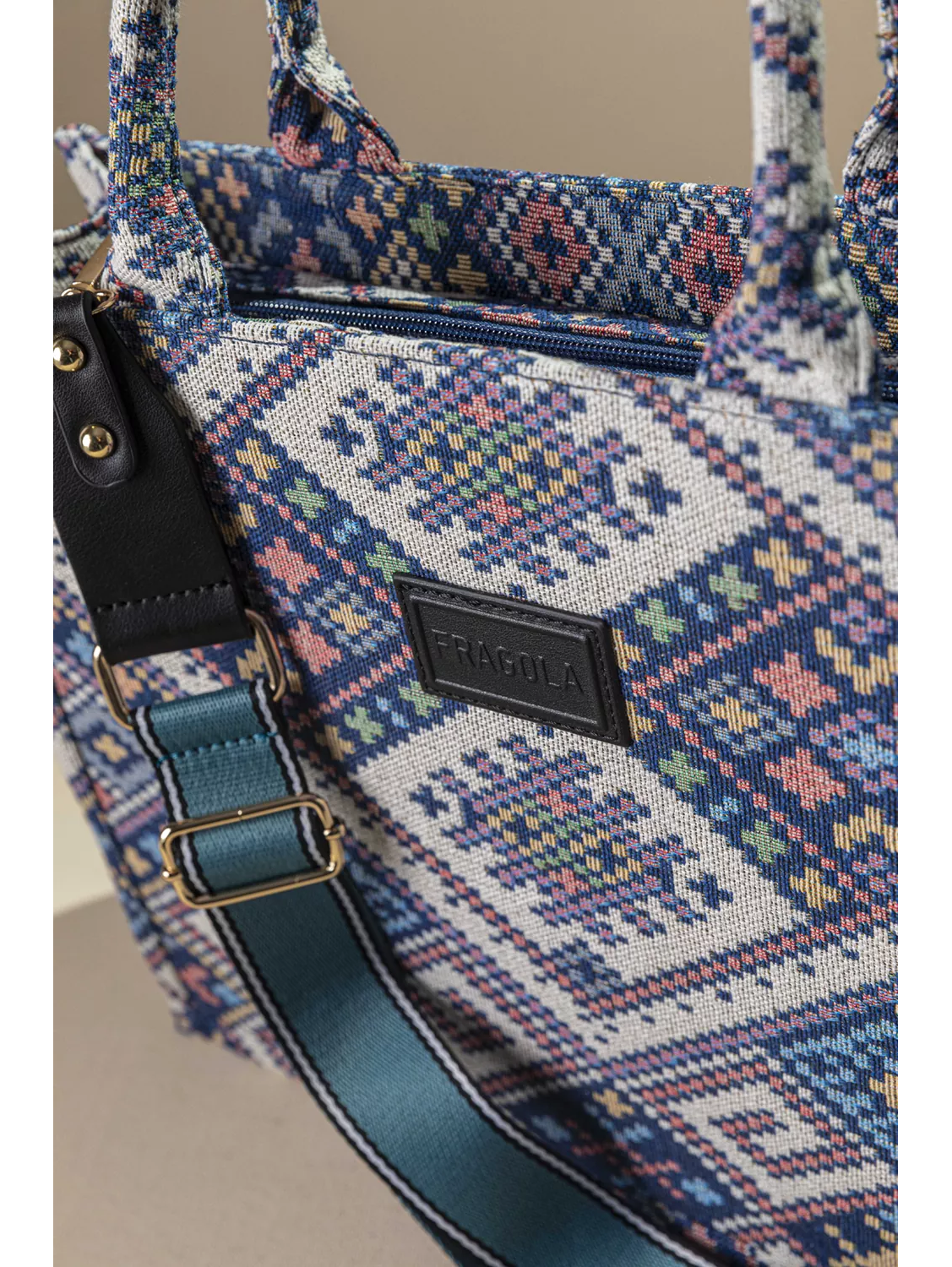 • Κατασκευασμένη από υψηλής ποιότητας υφαντό ύφασμα, προσφέρει ανθεκτικότητα και πολυτελή υφή. • Διαθέτει στιβαρά κοντά χέρια για κράτημα στο χέρι καθώς και αποσπώμενο ρυθμιζόμενο ιμάντα ώμου, επιτρέποντας να φορεθεί άνετα και ως χιαστί. • Οι μεταλλικές λεπτομέρειες σε χρυσό τόνο. προσφέρουν κομψότητα ενώ το λογότυπο Fragola στο μπροστινό μέρος, υπογραμμίζει την ταυτότητα που Brand. • Πρακτικό για τα καθημερινά must σας που λόγω του μεγάλου μεγέθους της είναι ιδανική για κράτημα απο το πρωί έως το απόγευμα, κλείνει με φερμουάρ. Υλικο: Υφαντό πανί σε εντυπωσιακά animal prints, γεωμετρικά σχήματα, μοτίβα απο την φύση, και tranditional print.