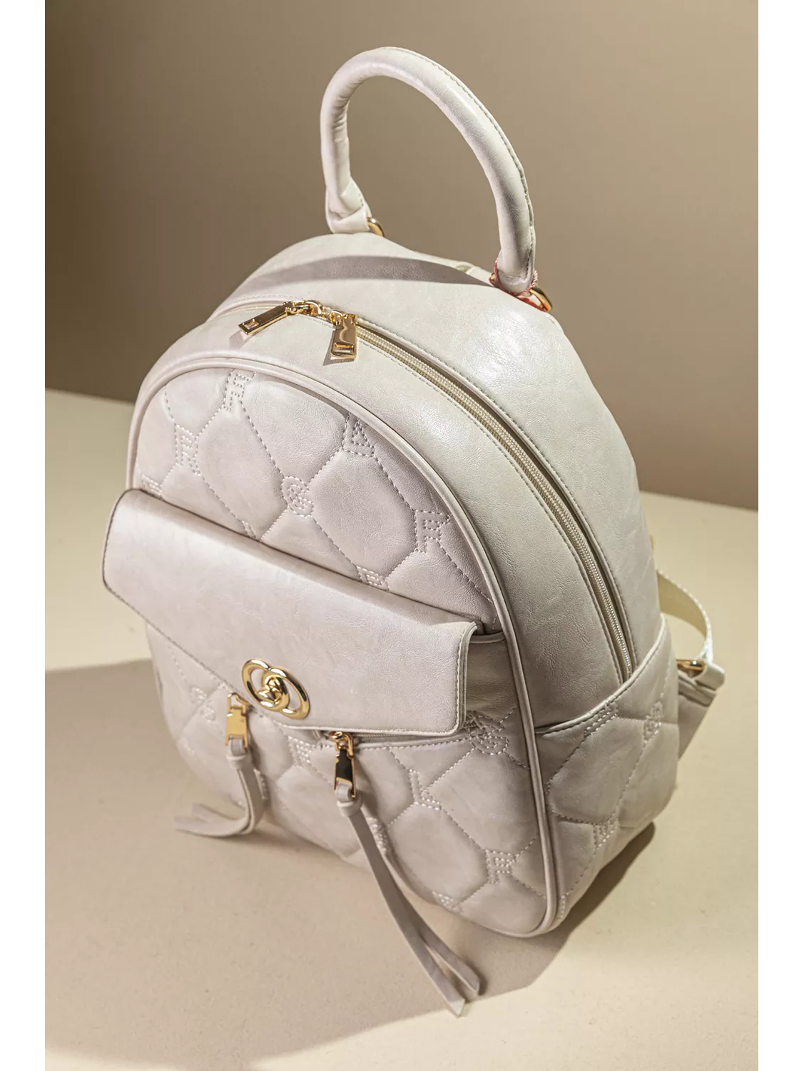 • Μπροστά εξωτερικά δύο μικρά τσεπάκια με φερμουάρ και μια μεγαλύτερη θήκη που κλείνει με καπάκι και ιδιαίτερο χρυσό εντυπωσιακό εξάρτημα.