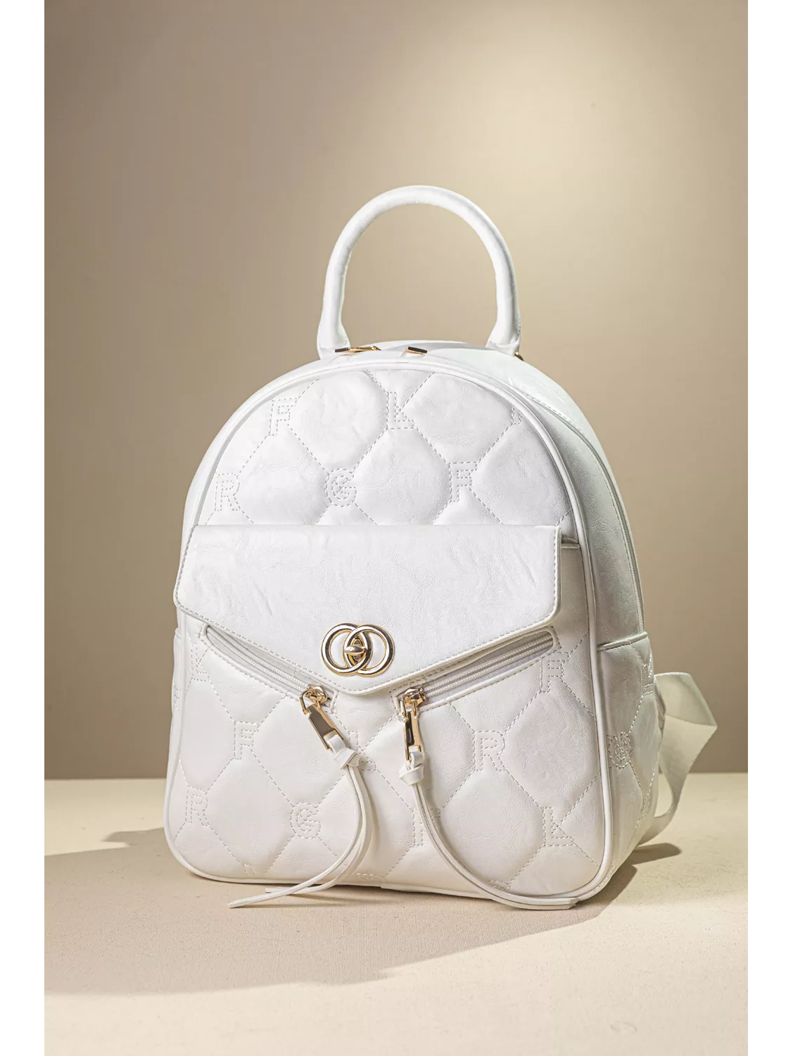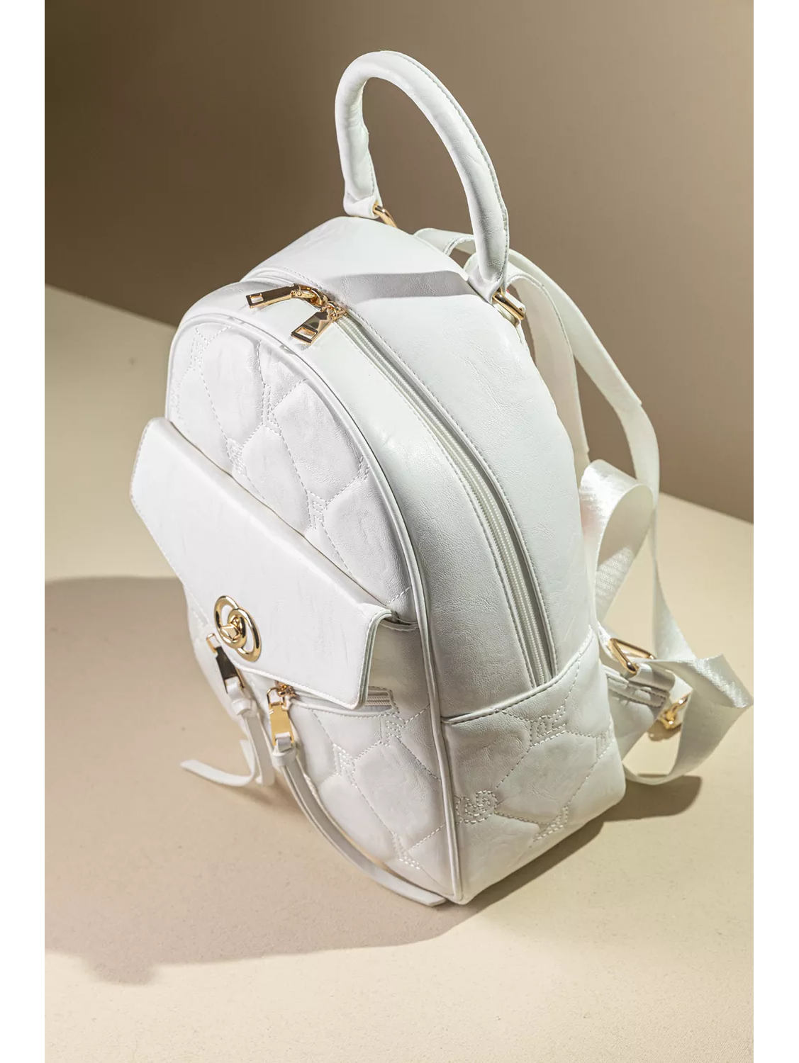 • Μπροστά εξωτερικά δύο μικρά τσεπάκια με φερμουάρ και μια μεγαλύτερη θήκη που κλείνει με καπάκι και ιδιαίτερο χρυσό εντυπωσιακό εξάρτημα.