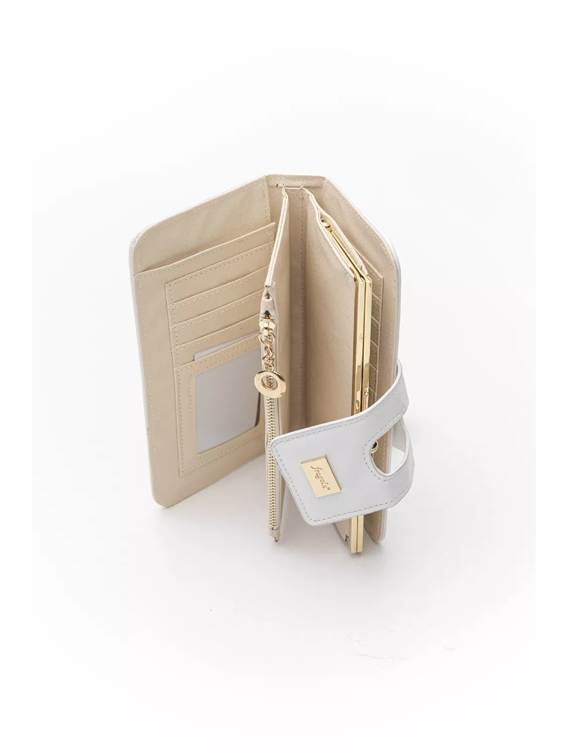 Μεγάλο πορτοφόλι με γλώσσα με μαγνητικό button. Στο εσωτερικό υπάρχουν πολλές θήκες για κάρτες και έξτρα μεγάλες θέσεις για την ταυτότητα και τις σημειώσεις σας. Διαχωρισμένη θήκη με φερμουάρ και έξτρα θήκη με στόμιο. Χώρος στο μέσον του για το κινητό σας ή τις σημειώσεις σας. Υλικό: Ματ οικολογικό δέρμα