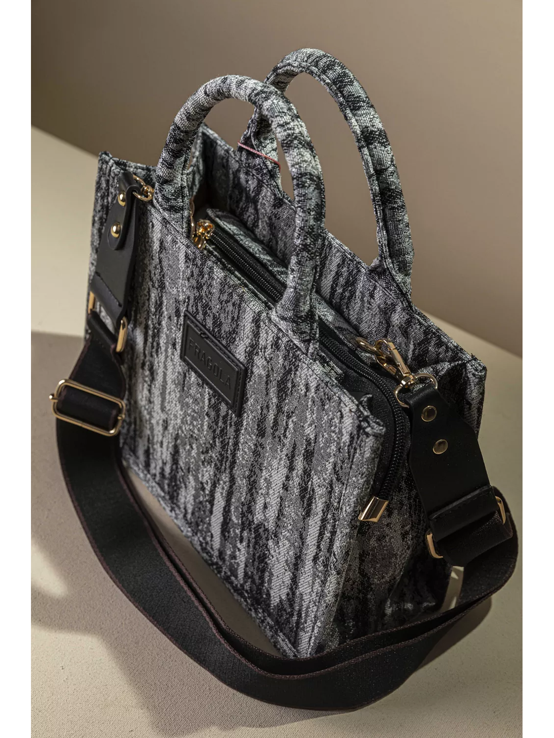 • Κατασκευασμένη από υψηλής ποιότητας υφαντό ύφασμα, προσφέρει ανθεκτικότητα και πολυτελή υφή. • Διαθέτει στιβαρά κοντά χέρια για κράτημα στο χέρι καθώς και αποσπώμενο ρυθμιζόμενο ιμάντα ώμου, επιτρέποντας να φορεθεί άνετα και ως χιαστί. • Οι μεταλλικές λεπτομέρειες σε χρυσό τόνο προσφέρουν κομψότητα ενώ το λογότυπο Fragola στο μπροστινό μέρος, υπογραμμίζει την ταυτότητα που Brand. • Πρακτικό για τα καθημερινά must σας που λόγω του μεσαίου μεγέθους της είναι ιδανική για κράτημα από το πρωί έως το βραδύ, κλείνει με φερμουάρ. Υλικο: Υφαντό πανί σε εντυπωσιακά animal prints, γεωμετρικά σχήματα, μοτίβα από την φύση, και tranditional print.
