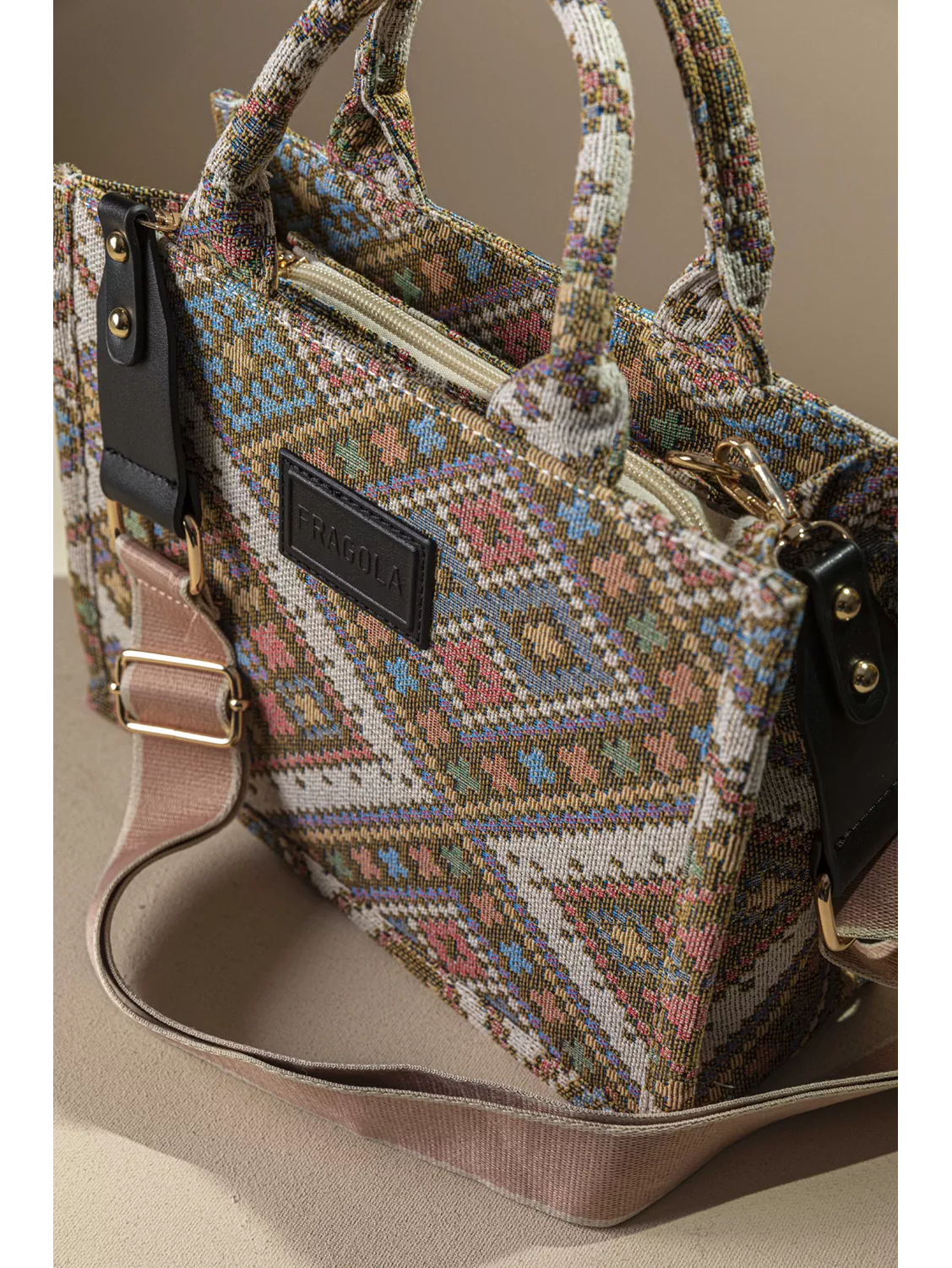 • Κατασκευασμένη από υψηλής ποιότητας υφαντό ύφασμα, προσφέρει ανθεκτικότητα και πολυτελή υφή. • Διαθέτει στιβαρά κοντά χέρια για κράτημα στο χέρι καθώς και αποσπώμενο ρυθμιζόμενο ιμάντα ώμου, επιτρέποντας να φορεθεί άνετα και ως χιαστί. • Οι μεταλλικές λεπτομέρειες σε χρυσό τόνο προσφέρουν κομψότητα ενώ το λογότυπο Fragola στο μπροστινό μέρος, υπογραμμίζει την ταυτότητα που Brand. • Πρακτικό για τα καθημερινά must σας που λόγω του μεσαίου μεγέθους της είναι ιδανική για κράτημα από το πρωί έως το βραδύ, κλείνει με φερμουάρ. Υλικο: Υφαντό πανί σε εντυπωσιακά animal prints, γεωμετρικά σχήματα, μοτίβα από την φύση, και tranditional print.