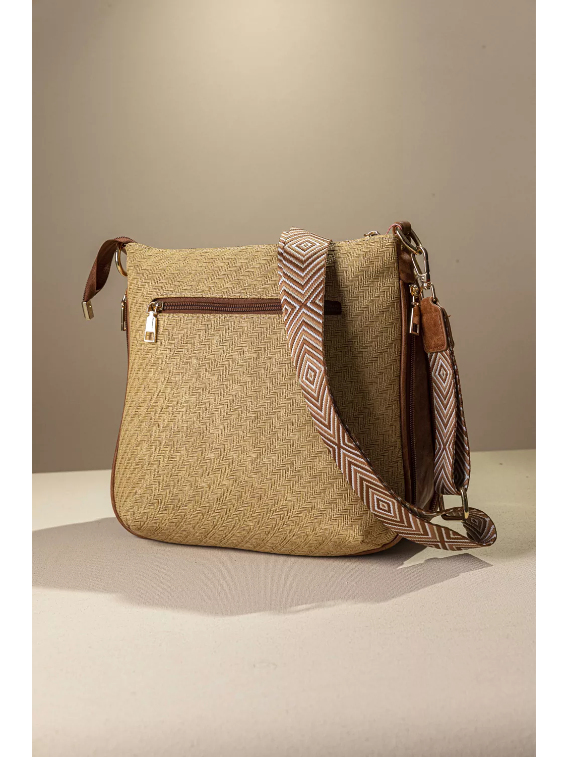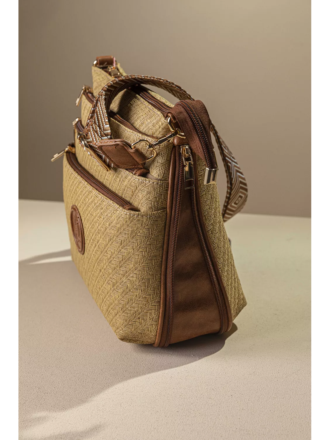 Υλικό: Συνθετικό ανάγλυφο δέρμα με μορφή ψάθας σε γήινα χρώματα.