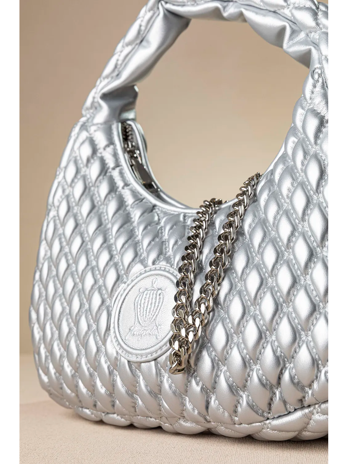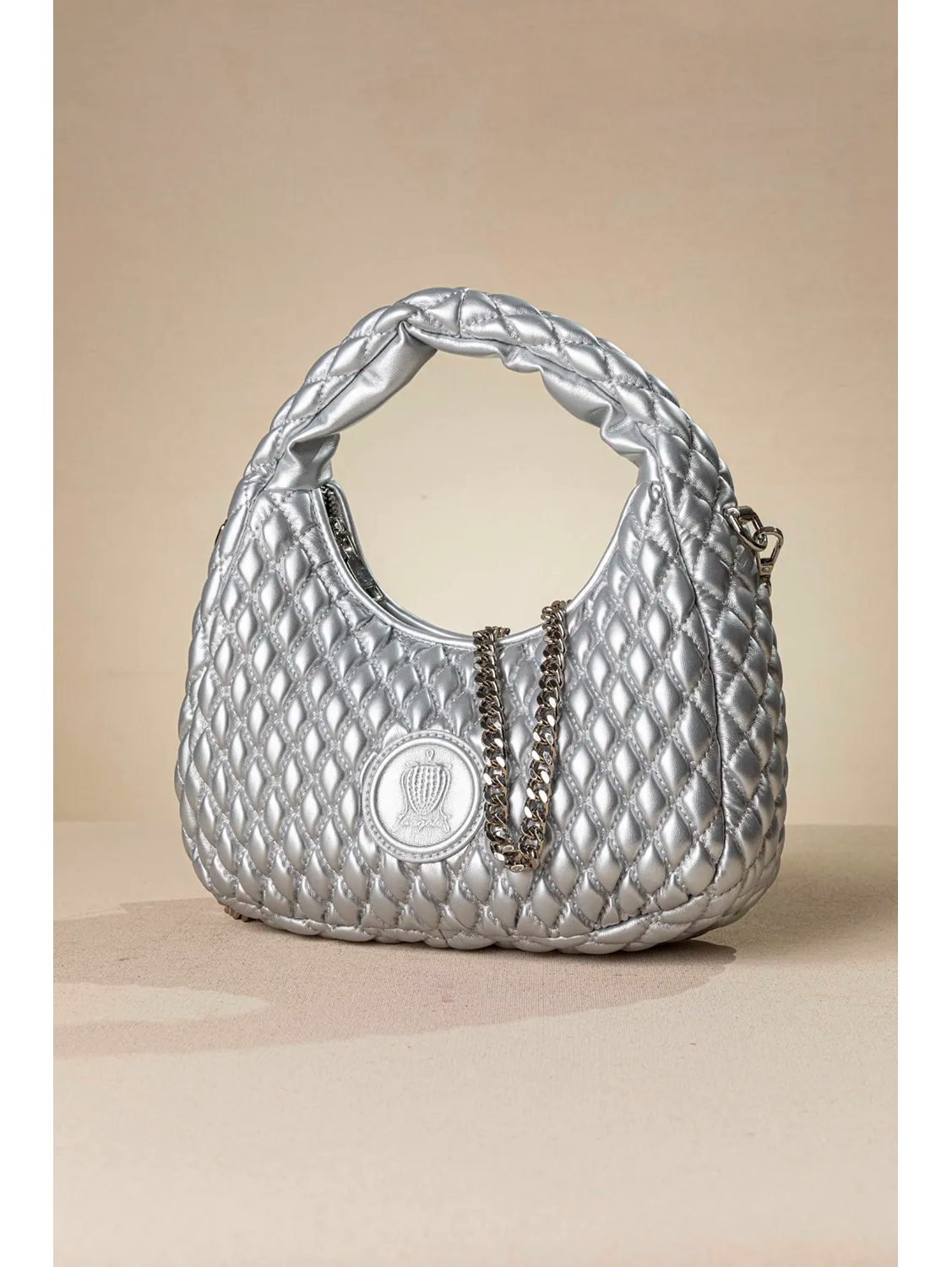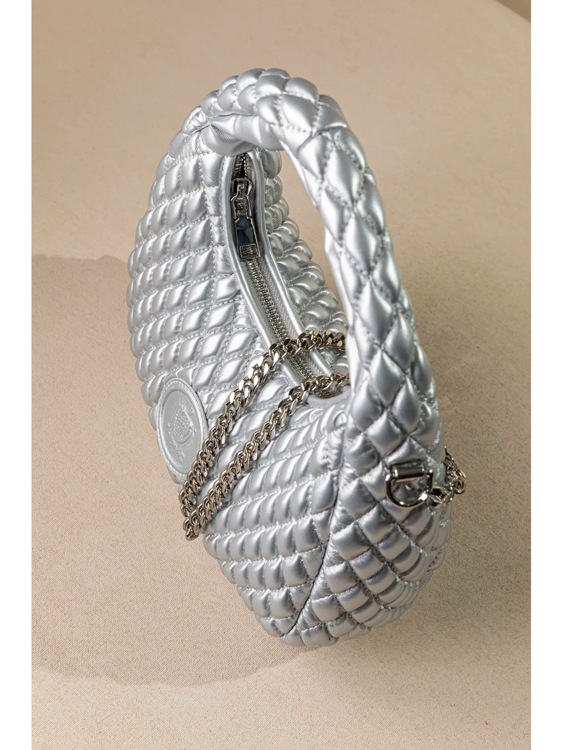 Οβάλ τσαντάκι με αφαιρούμενη τροχισμένη αλυσίδα που βοηθάει να μετατρέπεται σε στιλάτη χιαστί τσάντα. Στο εσωτερικό της θα βρείτε τα απαραίτητα μικρά τσεπάκια, ένα με φερμουάρ και ένα χωρίς για αποθήκευση μικροαντικειμένων.