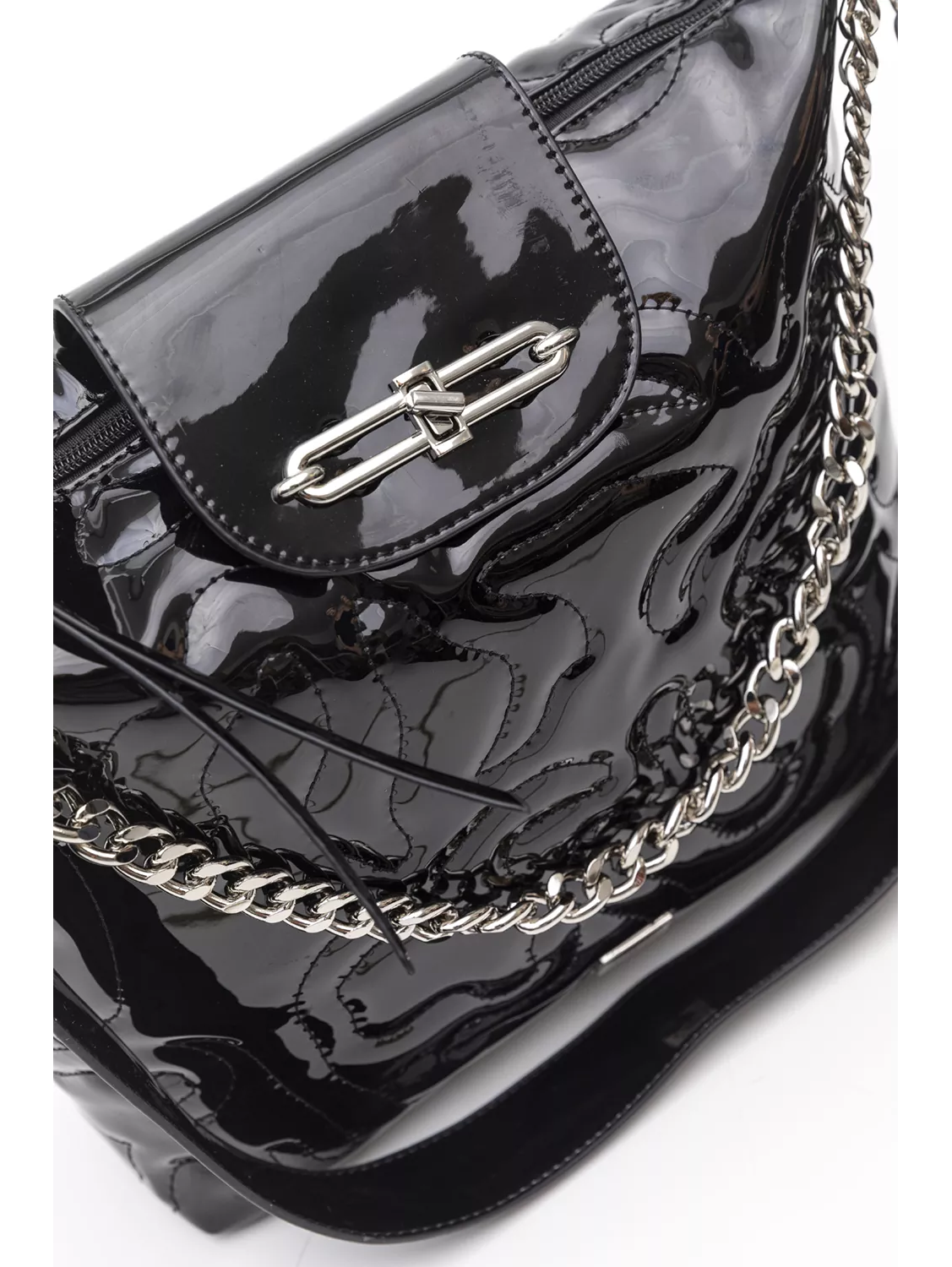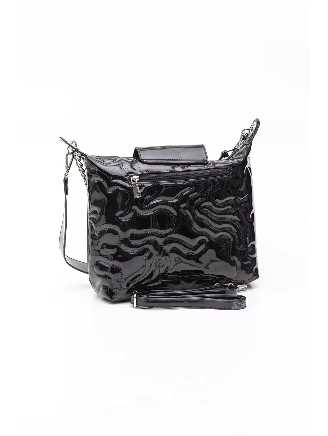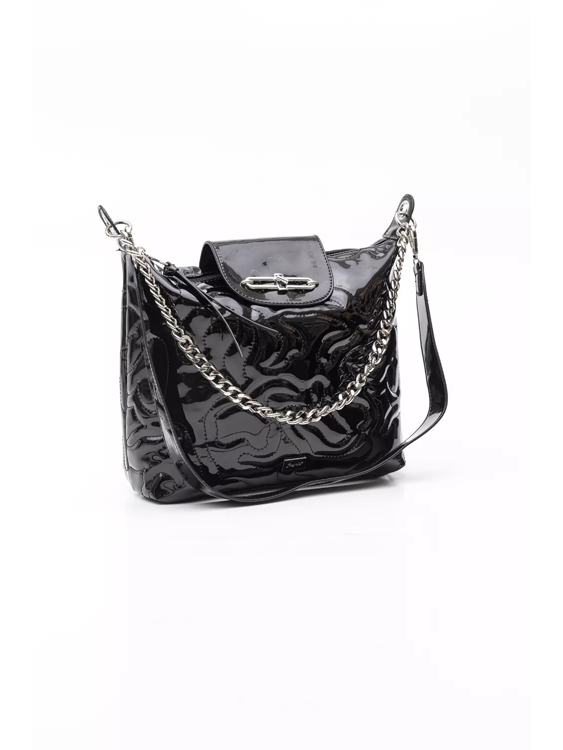 Πολυμορφική τσάντα μεσαίου μεγέθους. Ενιαίος εσωτερικός χώρος με τα βοηθητικά τσεπάκια και εξωτερική βοηθητική τσέπη με φερμουάρ και έξτρα κλείσιμο με μικρό καπάκι με κλειδαριά. Διαθέτει τρία διαφορετικά χέρια. Ένα χέρι ώμου για ολη την ημέρα. Χοντρή αλυσίδα που μπορεί να χρησιμοποιηθεί είτε ως διακοσμητικό της τσάντας είτε ως χέρι ώμου για βραδινή έξοδο. Τρίτο χέρι με το οποίο μπορεί να κρατηθεί χιαστί.