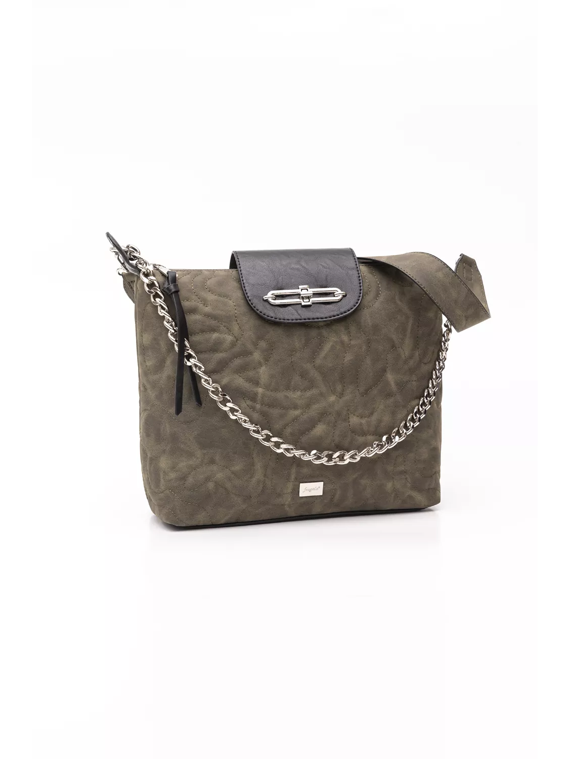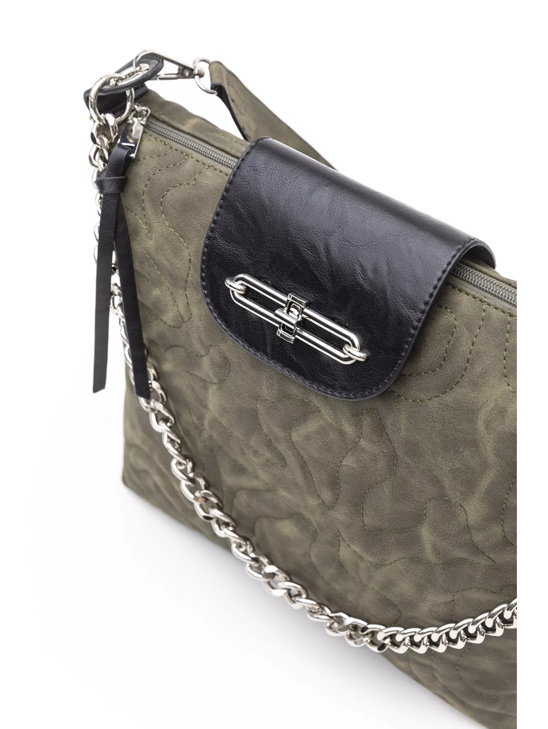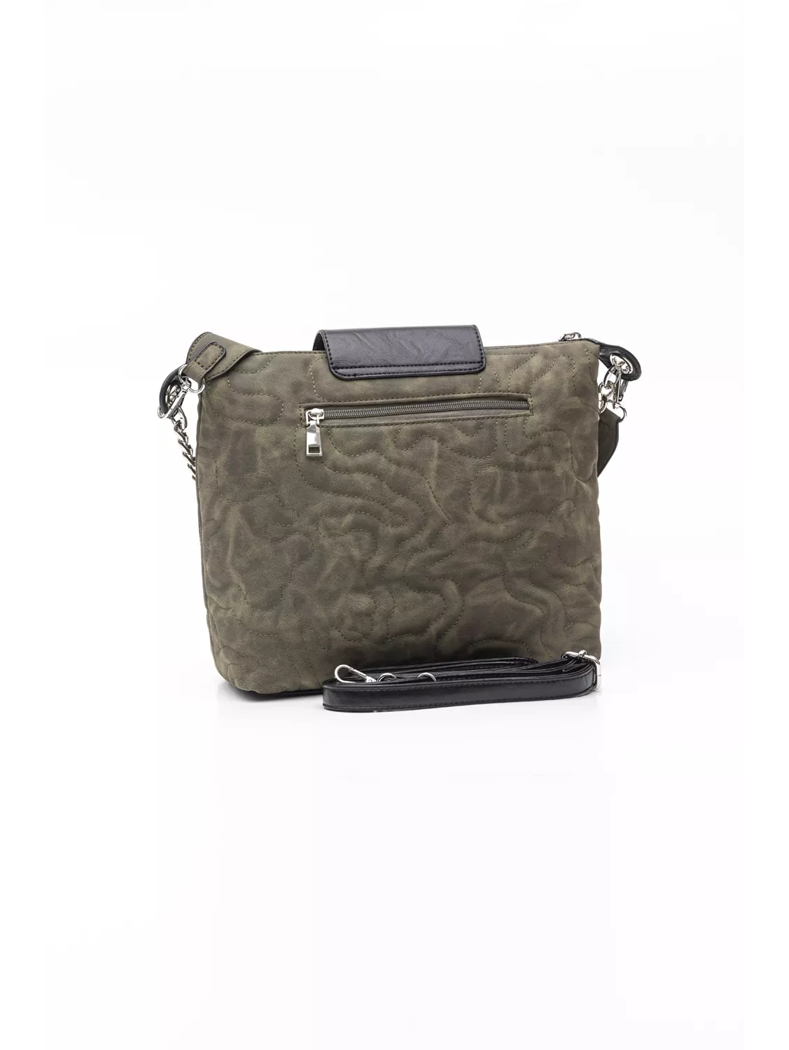 Πολυμορφική τσάντα μεσαίου μεγέθους. Ενιαίος εσωτερικός χώρος με τα βοηθητικά τσεπάκια και εξωτερική βοηθητική τσέπη με φερμουάρ και έξτρα κλείσιμο με μικρό καπάκι με κλειδαριά. Διαθέτει τρία διαφορετικά χέρια. Ένα χέρι ώμου για ολη την ημέρα. Χοντρή αλυσίδα που μπορεί να χρησιμοποιηθεί είτε ως διακοσμητικό της τσάντας είτε ως χέρι ώμου για βραδινή έξοδο. Τρίτο χέρι με το οποίο μπορεί να κρατηθεί χιαστί. Υλικό: Συνθετικό δέρμα με μαλακή υφή και puffy κυματοειδή γαζιά.