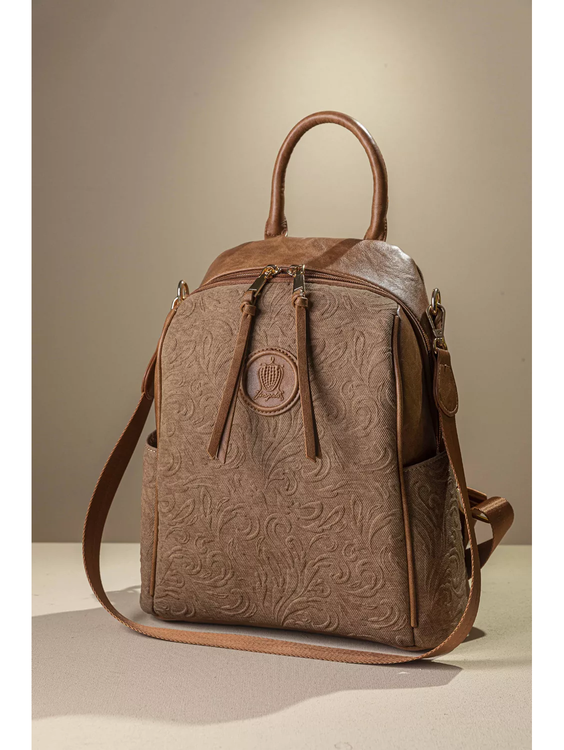 • Το απόλυτο backpack από soft υλικό, πολυμορφικό και In fashion. • Μπορείτε να το φορέστε σαν τσάντα πλάτης ή ώμου ανάλογα με την διάθεση! • Διαθέτει μια κεντρική μεγάλη θέση με τα κλασσικά μικρά τσεπάκια μέσα και ασφαλές κλείσιμο με φερμουάρ. Δύο βοηθητικές τσέπες δεξιά και αριστερά. • Εξωτερική κάθετη τσέπη στο πίσω μέρος της που κλείνει με φερμουάρ. Τα χεράκια των ώμων είναι δερματίνη με ιμάντα για μεγαλύτερη άνεση και καλύτερα εφαρμογή. Διαθέτει αφαιρούμενο ιμάντα ώμου. Υλικό: Συνθετικό δέρμα με υφή canva και εντυπωσιακό ανάγλυφο print.