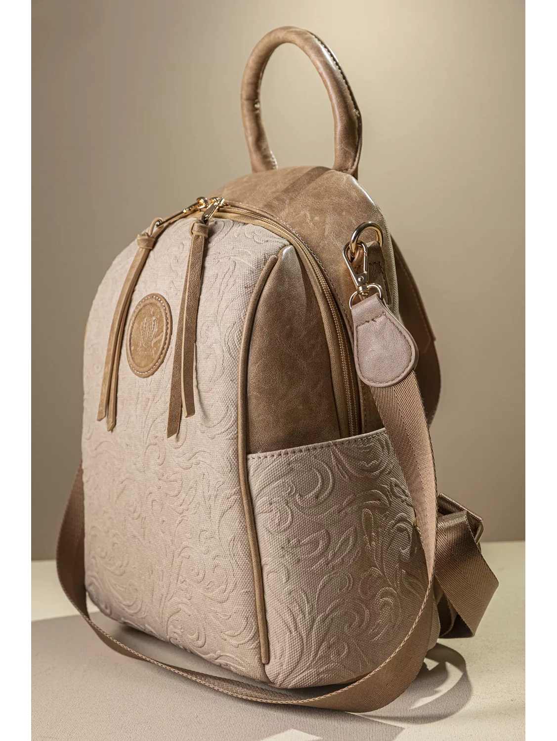 • Το απόλυτο backpack από soft υλικό, πολυμορφικό και In fashion. • Μπορείτε να το φορέστε σαν τσάντα πλάτης ή ώμου ανάλογα με την διάθεση! • Διαθέτει μια κεντρική μεγάλη θέση με τα κλασσικά μικρά τσεπάκια μέσα και ασφαλές κλείσιμο με φερμουάρ. Δύο βοηθητικές τσέπες δεξιά και αριστερά. • Εξωτερική κάθετη τσέπη στο πίσω μέρος της που κλείνει με φερμουάρ. Τα χεράκια των ώμων είναι δερματίνη με ιμάντα για μεγαλύτερη άνεση και καλύτερα εφαρμογή. Διαθέτει αφαιρούμενο ιμάντα ώμου. Υλικό: Συνθετικό δέρμα με υφή canva και εντυπωσιακό ανάγλυφο print.