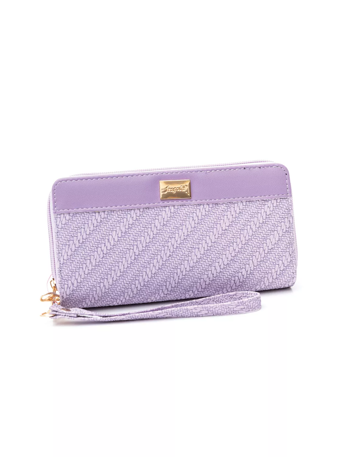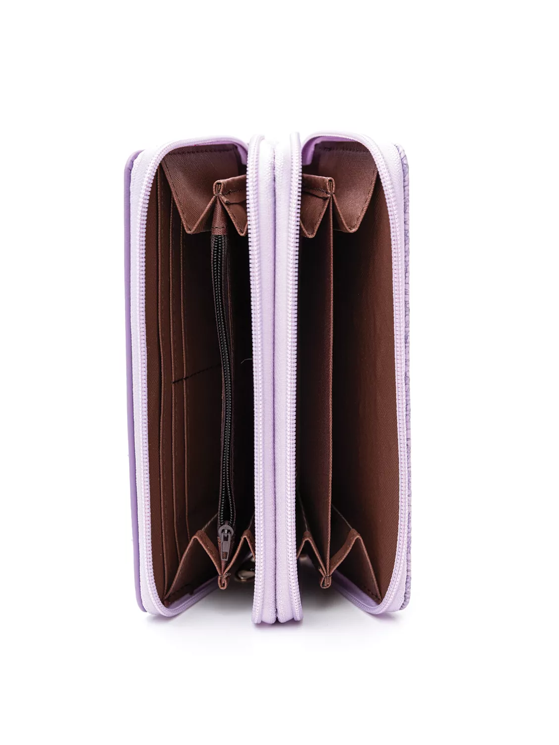 Πορτοφόλι διπλά ανοιγόμενο. Από τη μια πλευρά διαθέτει μια διθέσια θέση για κέρματα και δύο χώρους με φυσούνα χρηστικούς για διάφορα χαρτιά ή σημειώσεις και κλείνει με φερμουάρ. Από την άλλη διαθέτει θέση για χαρτονομίσματα, ταυτότητα, δίπλωμα και πολλές θέσεις για κάρτες. Κλείνει με γλωσσάκι που έχει σούστα.