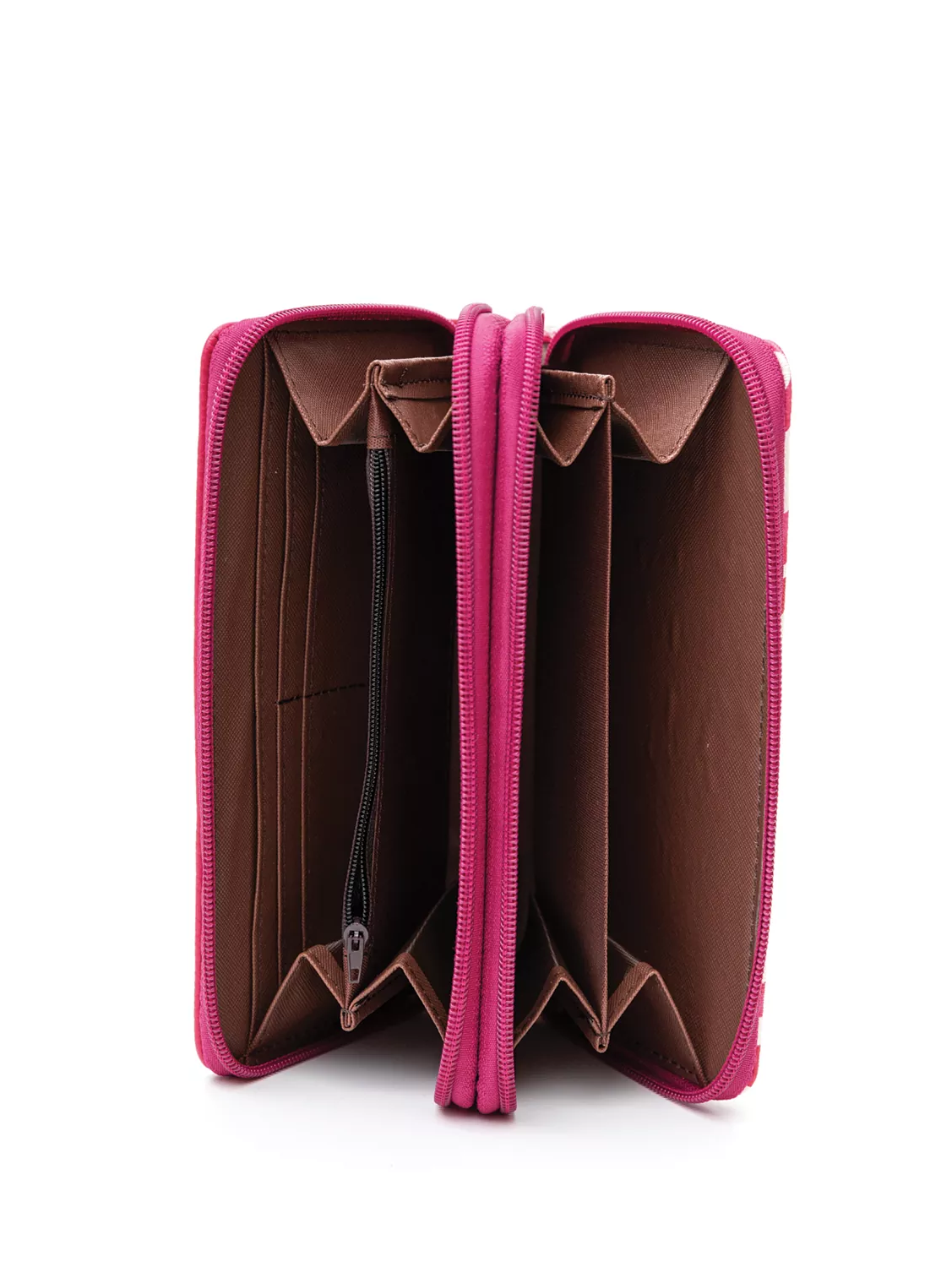 Πορτοφόλι διπλά ανοιγόμενο. Από τη μια πλευρά διαθέτει μια διθέσια θέση για κέρματα και δύο χώρους με φυσούνα χρηστικούς για διάφορα χαρτιά ή σημειώσεις και κλείνει με φερμουάρ. Από την άλλη διαθέτει θέση για χαρτονομίσματα, ταυτότητα, δίπλωμα και πολλές θέσεις για κάρτες. Κλείνει με γλωσσάκι που έχει σούστα. Υλικό: Συνθετικό δέρμα
