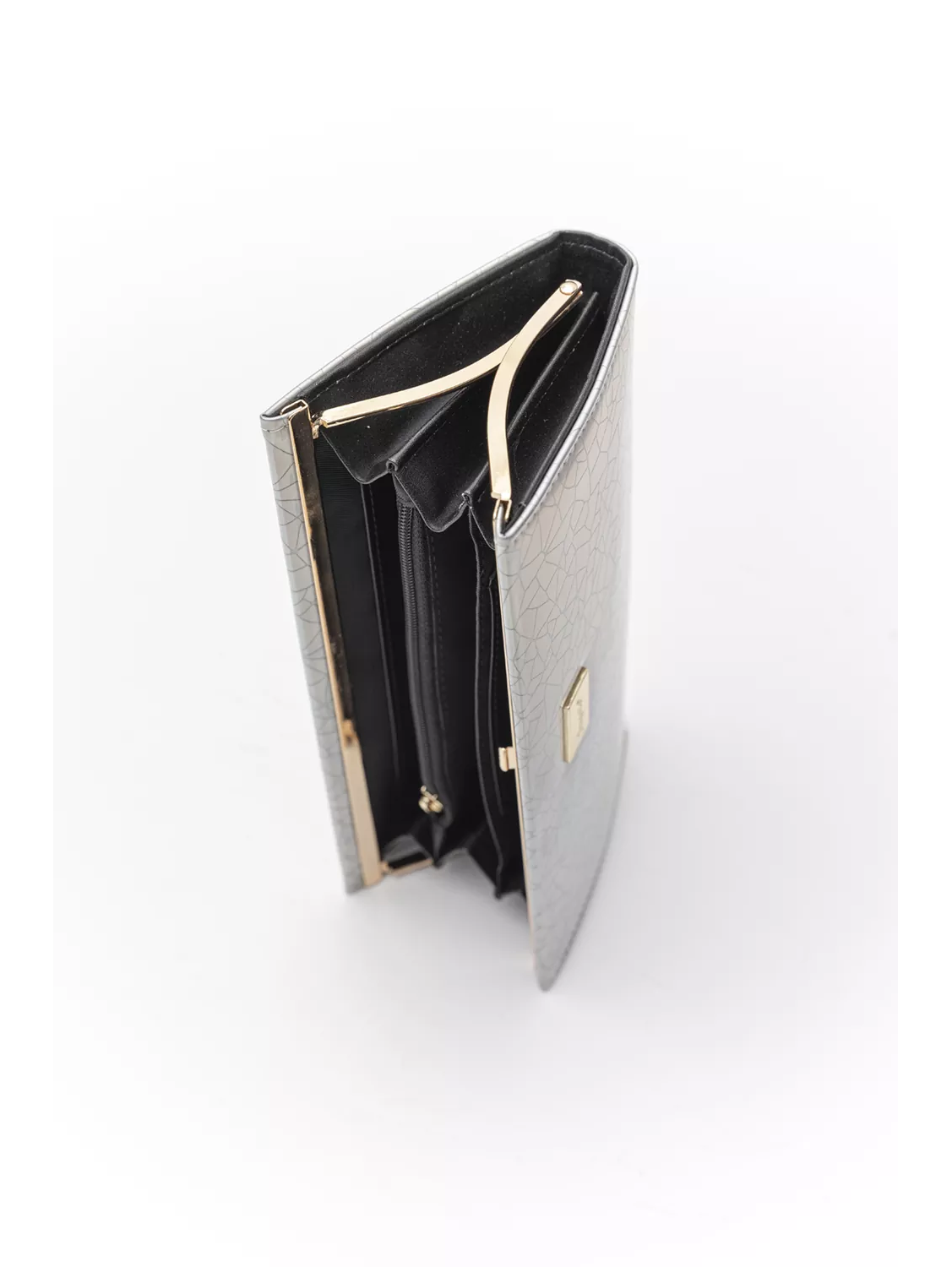 Πορτοφόλι με καινοτόμο άνοιγμα με μεταλλικά ελάσματα. Στο εσωτερικό του υπάρχουν όλες οι απαραίτητες θήκες ενός πορτοφολιού. Το συγκεκριμένο πορτοφόλι μπορεί να χρησιμοποιηθεί και ως clutch.