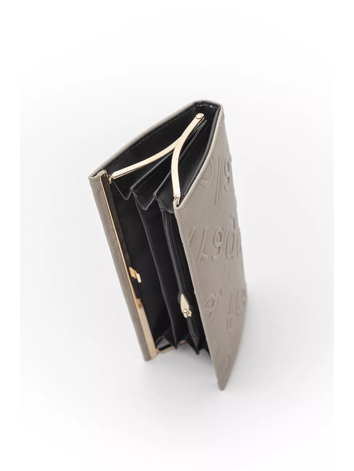 Πορτοφόλι με καινοτόμο άνοιγμα με μεταλλικά ελάσματα. Στο εσωτερικό του υπάρχουν όλες οι απαραίτητες θήκες ενός πορτοφολιού. Το συγκεκριμένο πορτοφόλι μπορεί να χρησιμοποιηθεί και ως clutch.