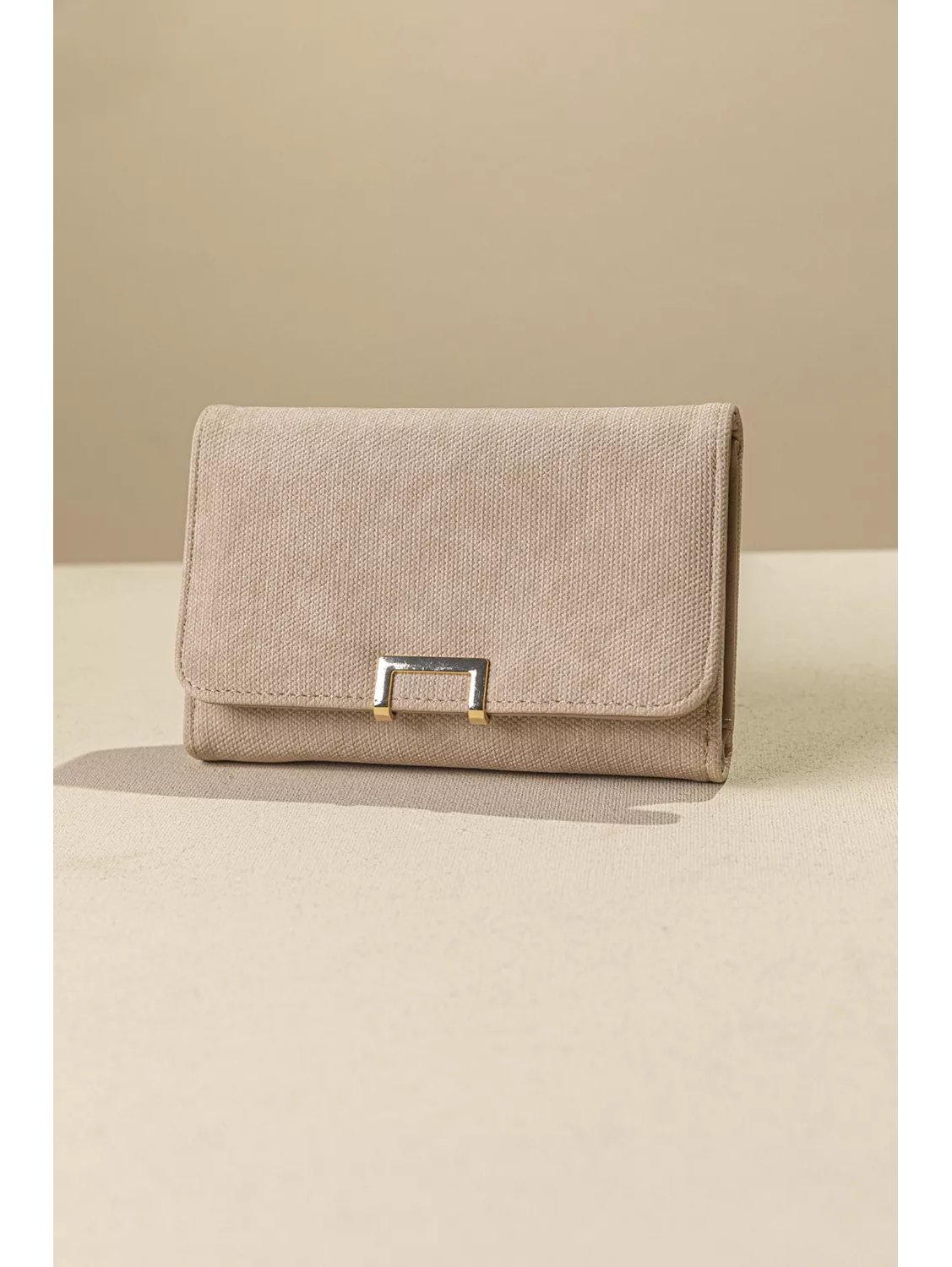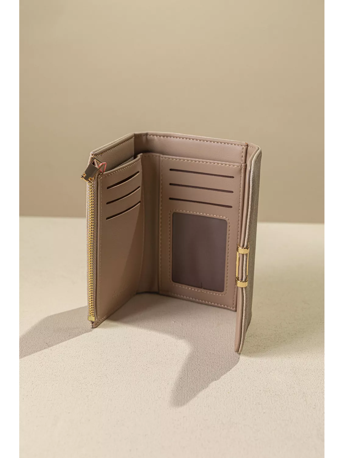 • Κομψό γυναικείο πορτοφόλι μεσαίου μεγέθους ιδανικό για καθημερινή χρήση. • Ο minimal σχεδιασμός του με το χρυσό μεταλλικό κούμπωμα χαρίζει μια διακριτική πολυτέλεια. Το εσωτερικό του είναι πρακτικά οργανωμένο με πολλαπλές θέσεις για κάρτες, διάφανη θήκη για ταυτότητα ή δίπλωμα, καθώς και ξεχωριστό χώρο για χαρτονομίσματα. • Διαθέτει επίσης θήκη για κέρματα με φερμουάρ, προσφέροντας εύκολη πρόσβαση. • Compact αλλά ευρύχωρο, χωράει όλα τα απαραίτητα χωρίς να πιάνει χώρο στη τσάντα σας. Υλικό: Συνθετικό δέρμα με υφή canva.