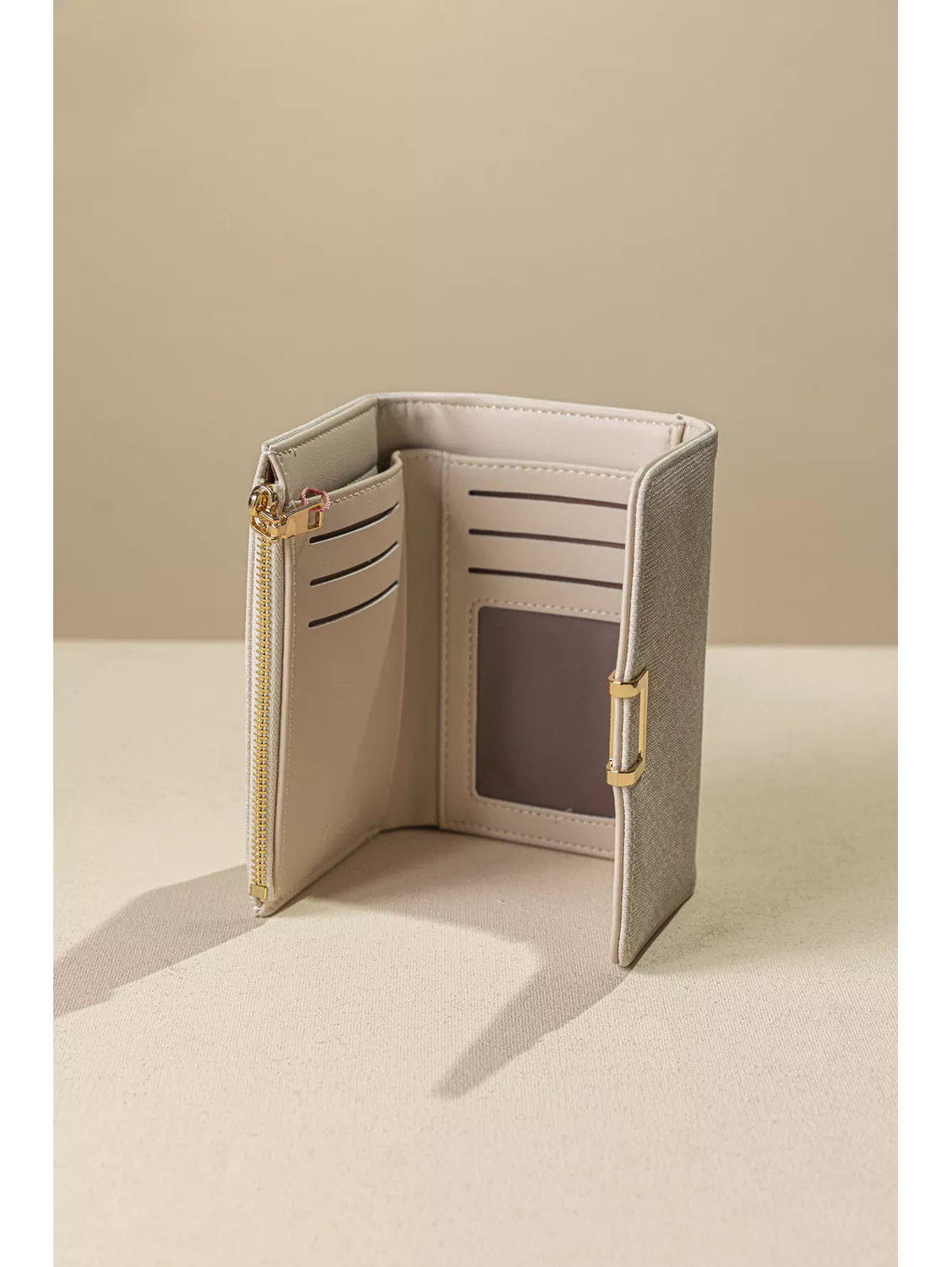 • Ο minimal σχεδιασμός του με το χρυσό μεταλλικό κούμπωμα χαρίζει μια διακριτική πολυτέλεια. Το εσωτερικό του είναι πρακτικά οργανωμένο με πολλαπλές θέσεις για κάρτες, διάφανη θήκη για ταυτότητα ή δίπλωμα, καθώς και ξεχωριστό χώρο για χαρτονομίσματα.
