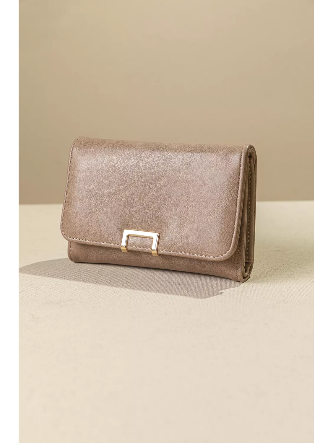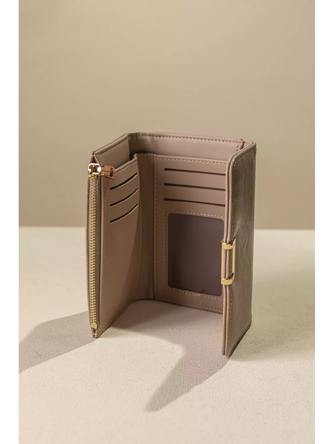 • Ο minimal σχεδιασμός του με το χρυσό μεταλλικό κούμπωμα χαρίζει μια διακριτική πολυτέλεια. Το εσωτερικό του είναι πρακτικά οργανωμένο με πολλαπλές θέσεις για κάρτες, διάφανη θήκη για ταυτότητα ή δίπλωμα, καθώς και ξεχωριστό χώρο για χαρτονομίσματα.