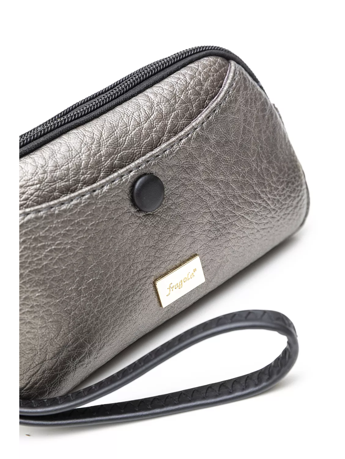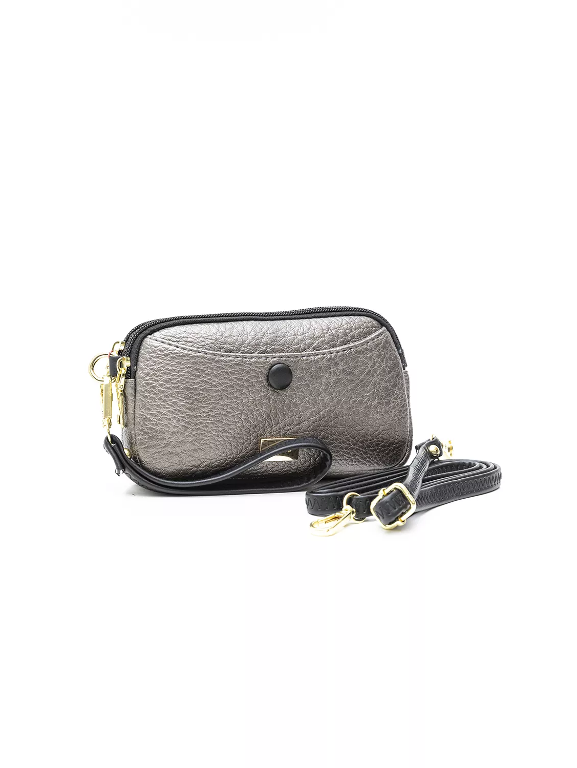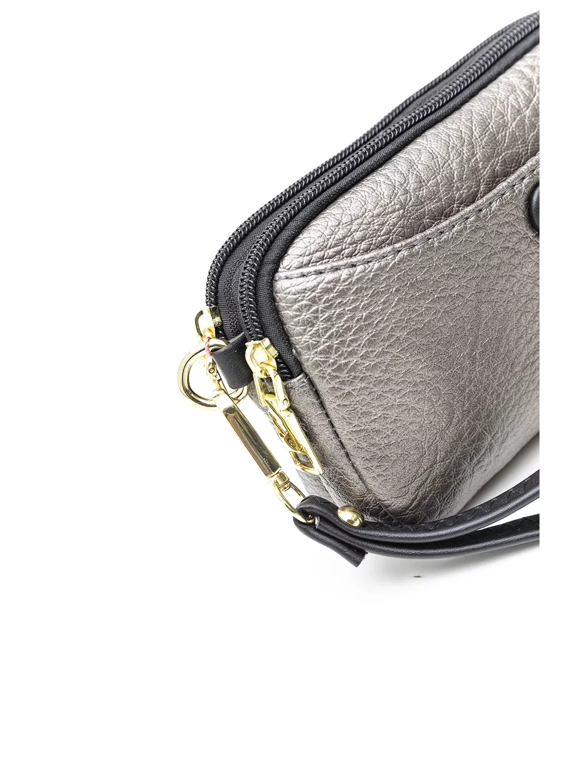Πορτοφόλι με δύο θήκες που κλείνουν με φερμουάρ. Στη φόδρα εσωτερικά τους θα βρείτε έξτρα μια μικρή θήκη με φερμουάρ και μια χωρίς. Στο μπροστά μέρος της τσάντας υπάρχει έξτρα θήκη που κλείνει με μαγνητικό μπουτόν. Διαθέτει κοντό χεράκι για τον καρπό.