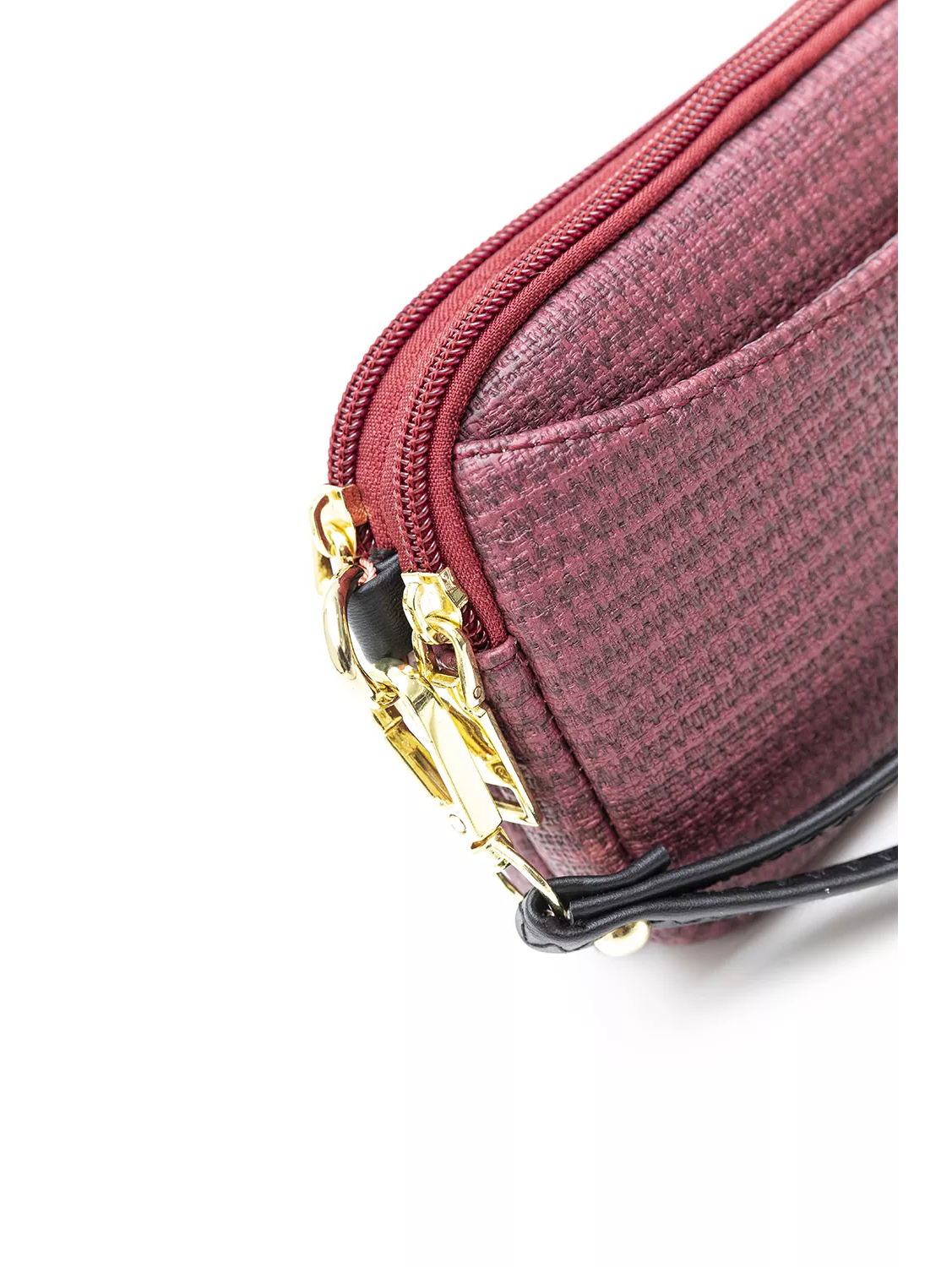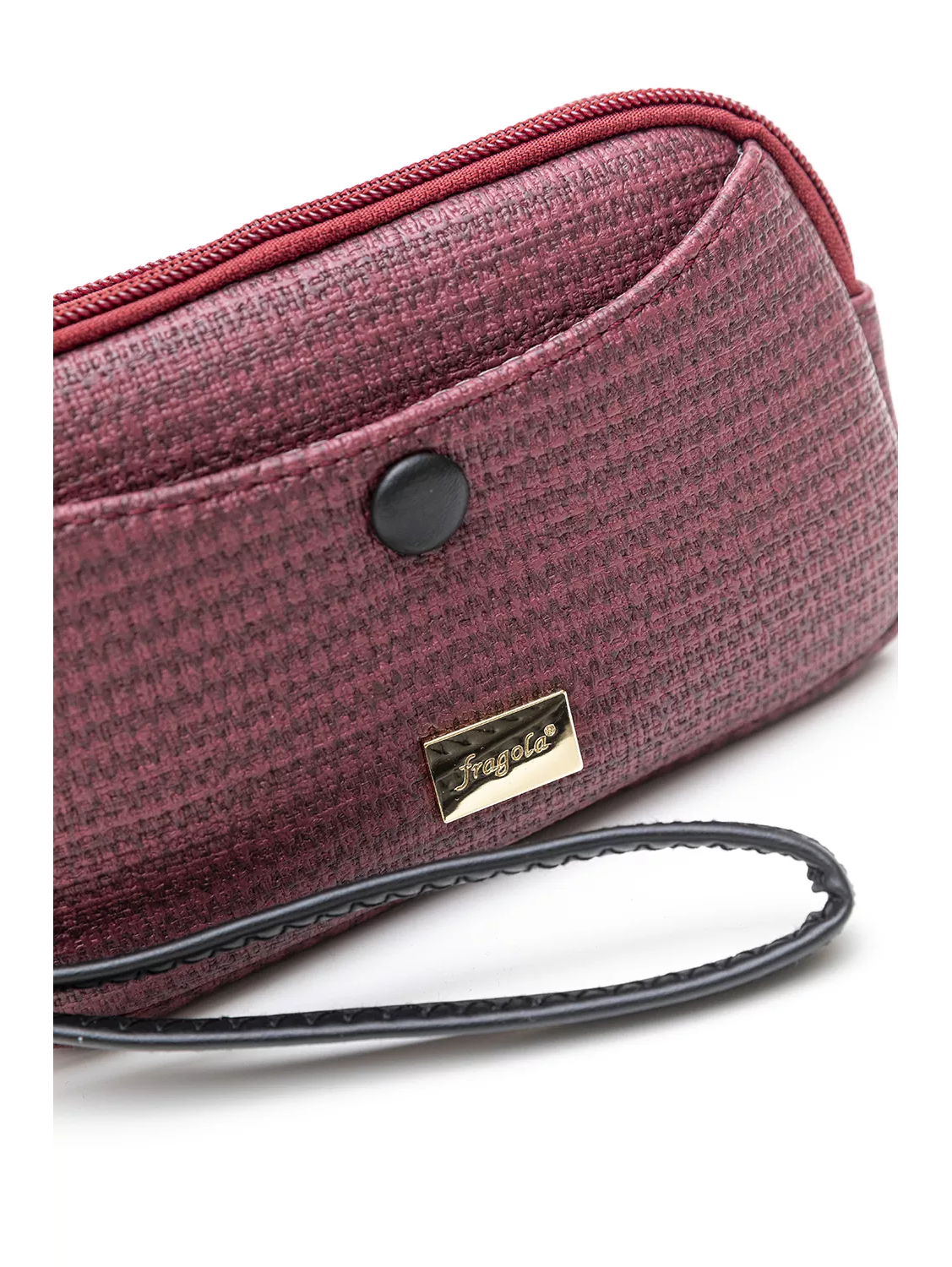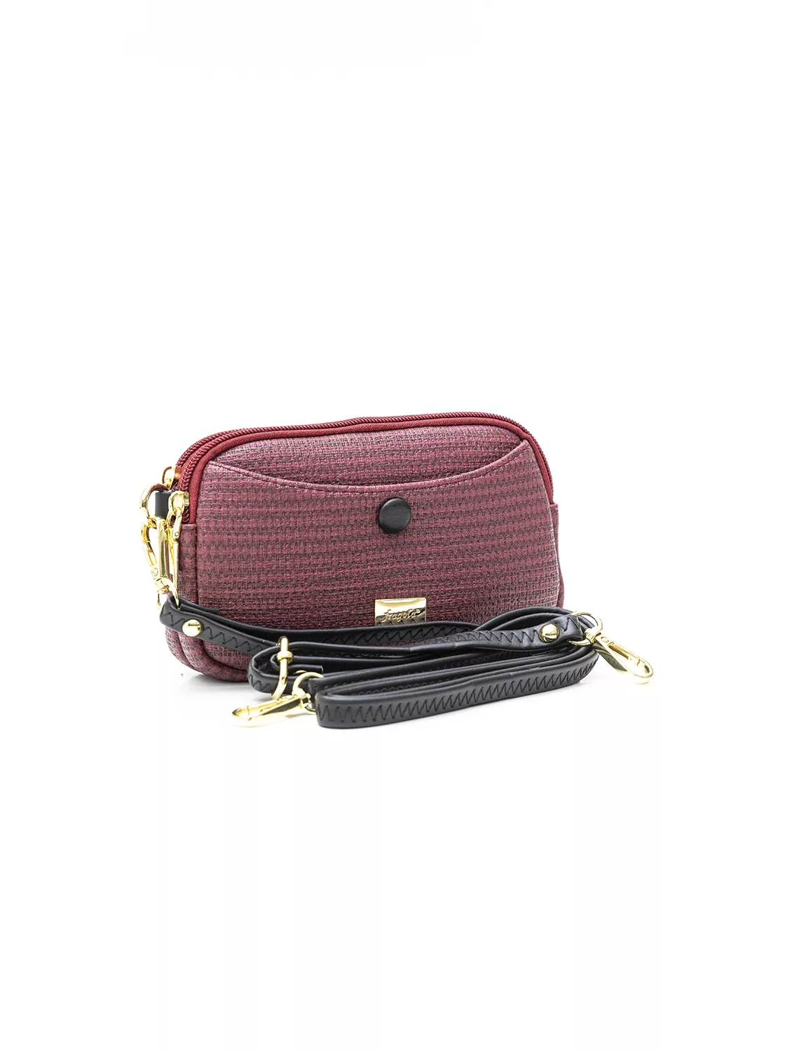 Πορτοφόλι με δύο θήκες που κλείνουν με φερμουάρ. Στη φόδρα εσωτερικά τους θα βρείτε έξτρα μια μικρή θήκη με φερμουάρ και μια χωρίς. Στο μπροστά μέρος της τσάντας υπάρχει έξτρα θήκη που κλείνει με μαγνητικό μπουτόν. Διαθέτει κοντό χεράκι για τον καρπό.