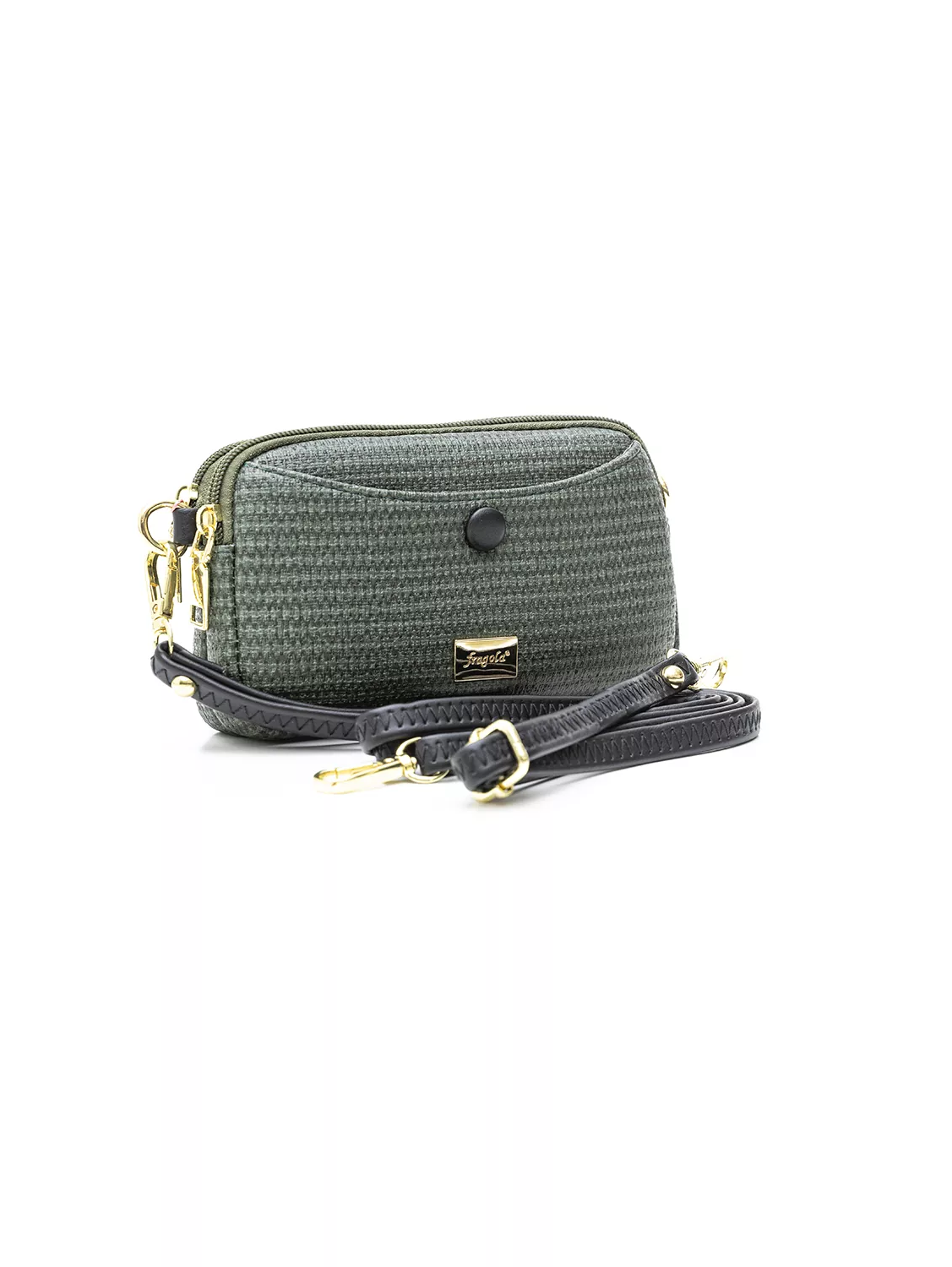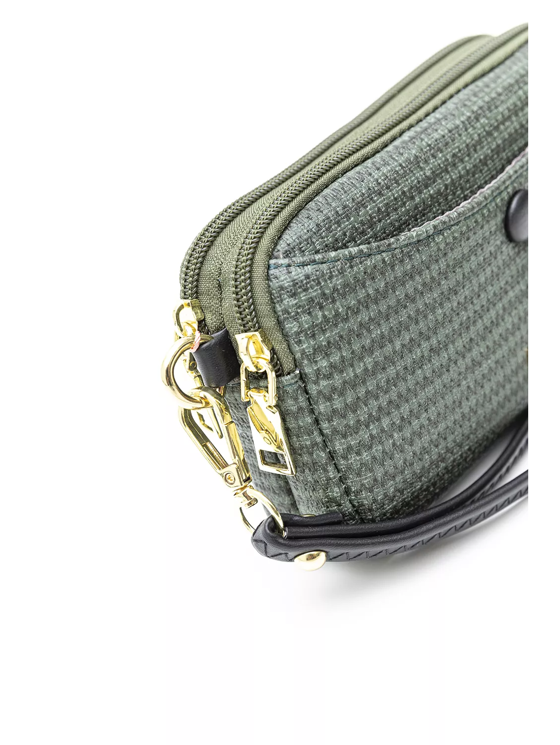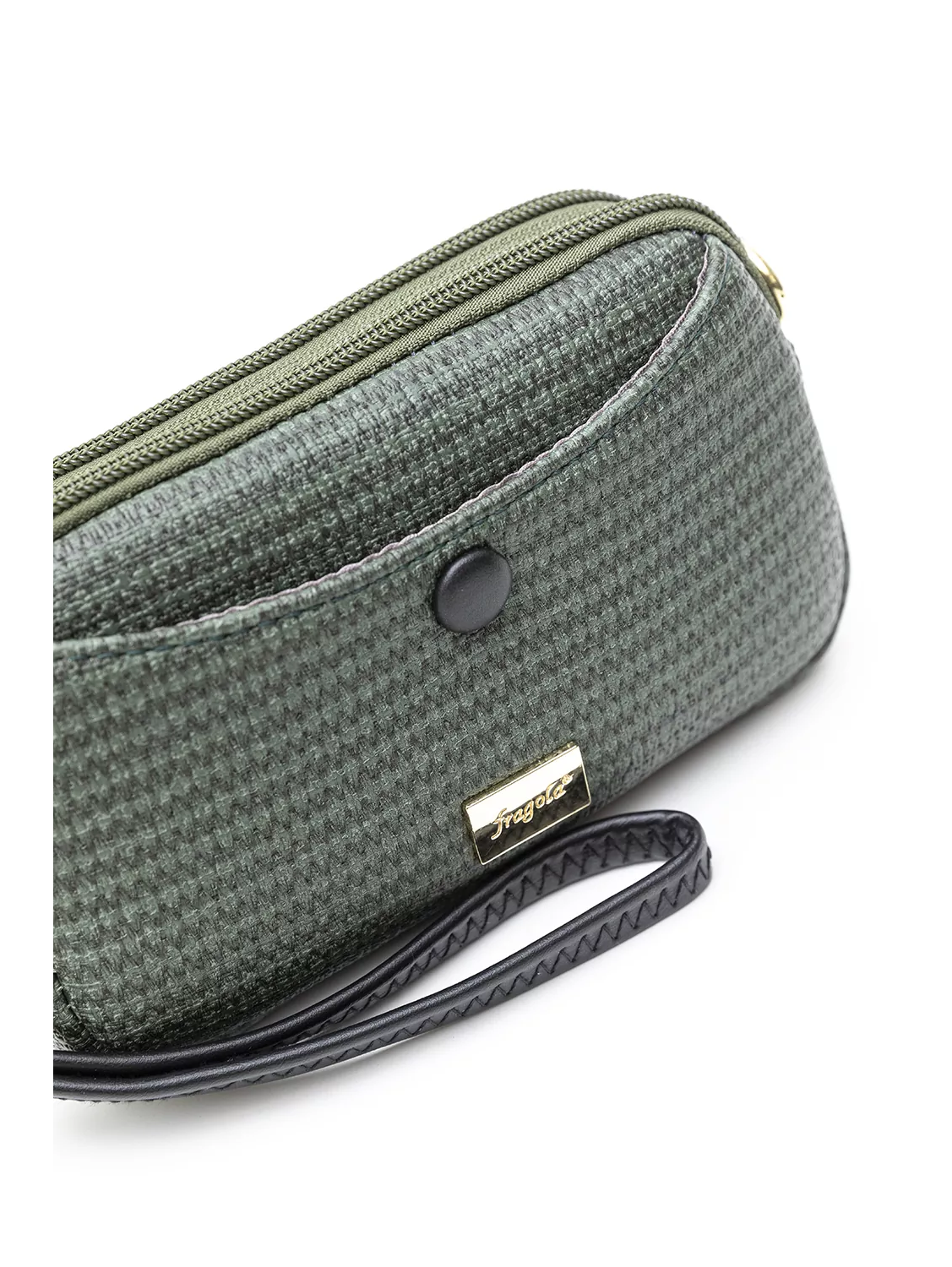 Πορτοφόλι με δύο θήκες που κλείνουν με φερμουάρ. Στη φόδρα εσωτερικά τους θα βρείτε έξτρα μια μικρή θήκη με φερμουάρ και μια χωρίς. Στο μπροστά μέρος της τσάντας υπάρχει έξτρα θήκη που κλείνει με μαγνητικό μπουτόν. Διαθέτει κοντό χεράκι για τον καρπό. Υλικό: Συνθετικό δέρμα