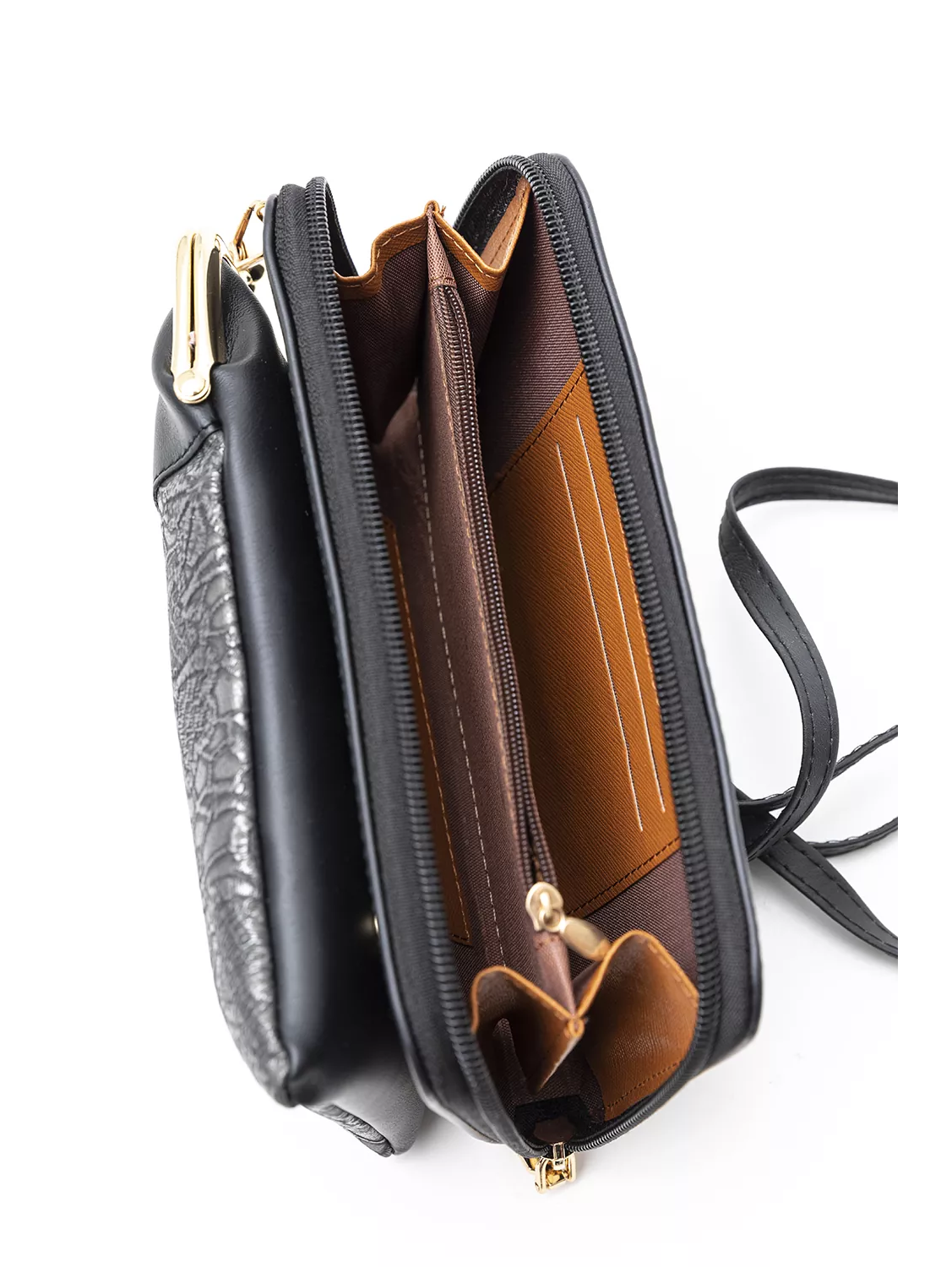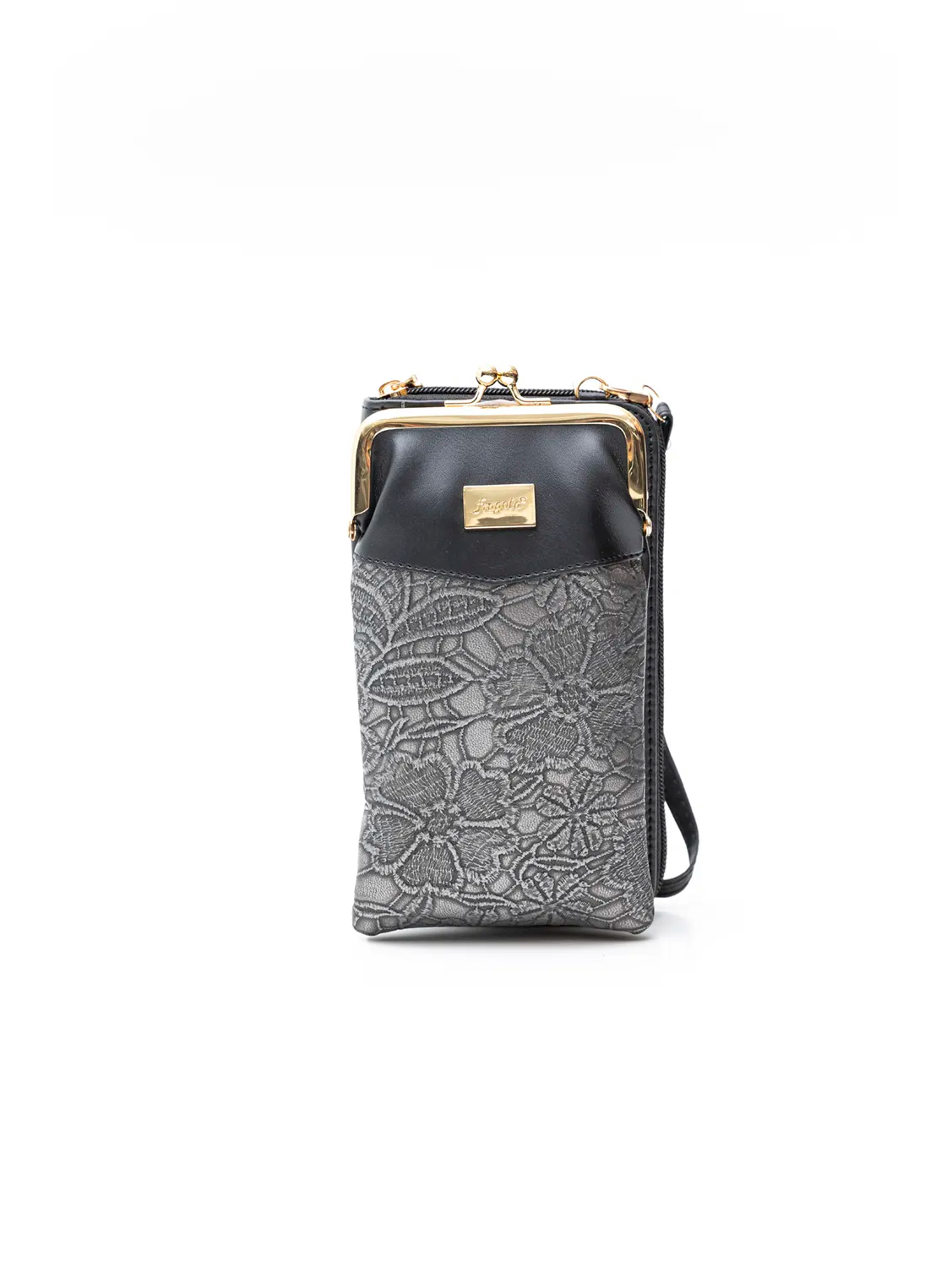 Πορτοφόλι τσαντάκι με extra χεράκι για χιαστί κράτημα. Διαθέτει μια διαχωρισμένη εξωτερική θέση για το κινητό, που κλείνει με μεταλλικό στόμιο, από τη μια πλευρά. Από την άλλη διαθέτει πορτοφόλι με θέση για κέρματα, χαρτονομίσματα και πολλές θέσεις για κάρτες. Κλείνει με φερμουάρ.