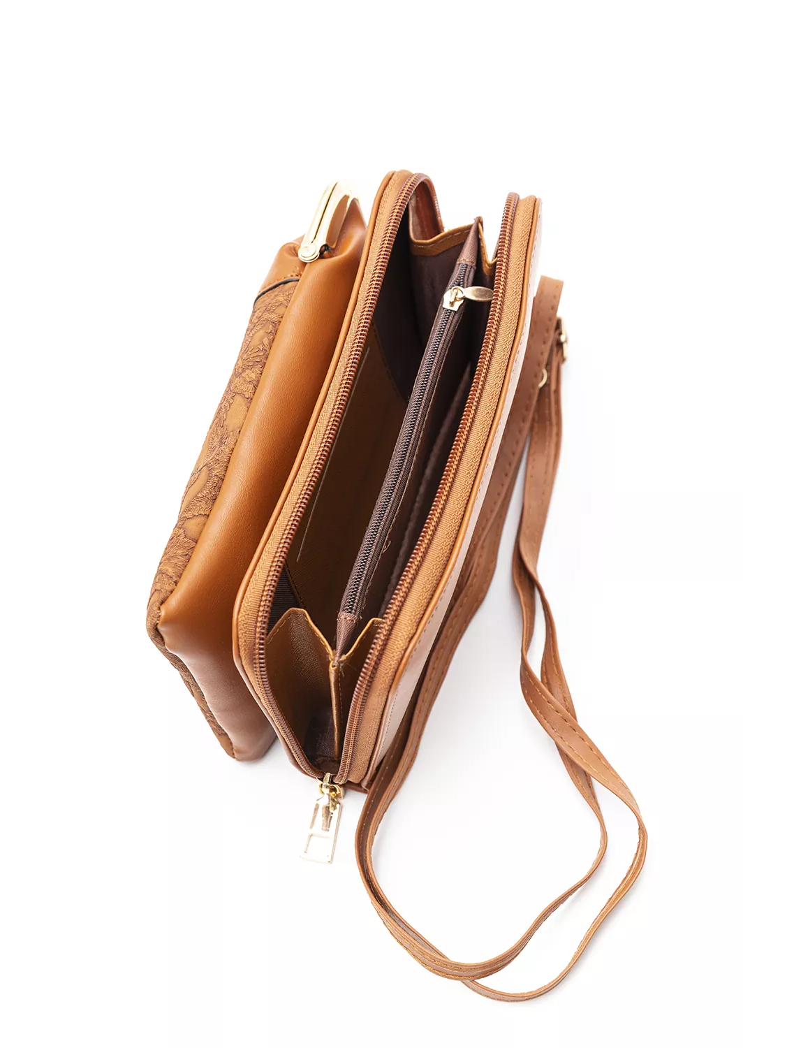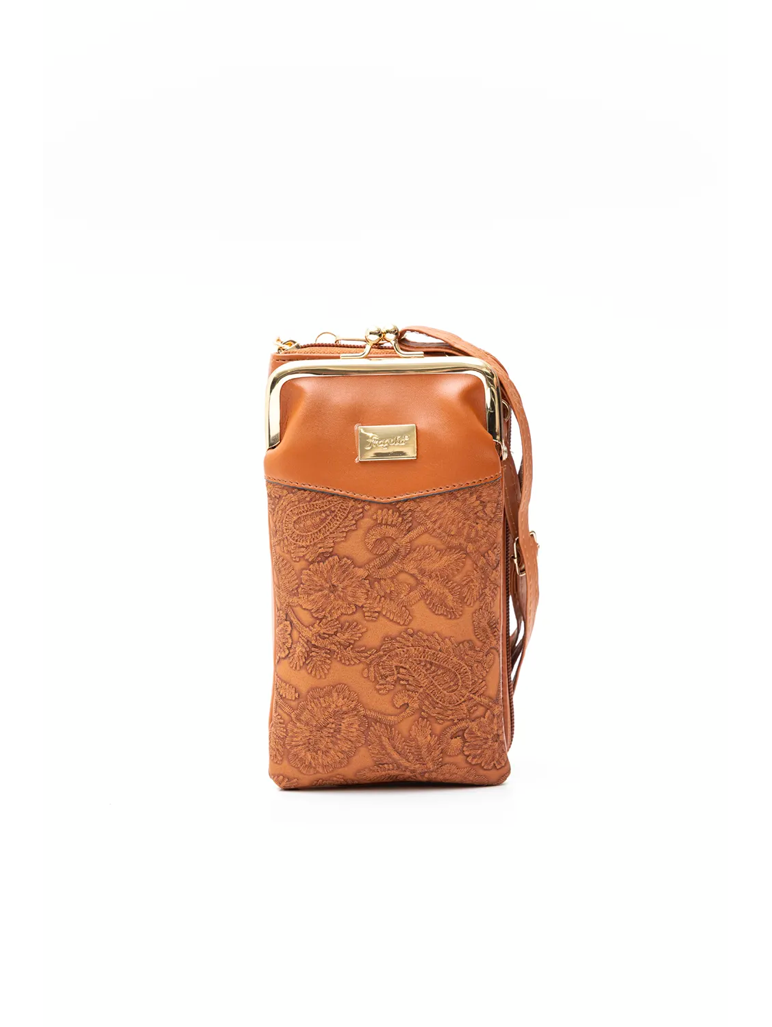 Πορτοφόλι τσαντάκι με extra χεράκι για χιαστί κράτημα. Διαθέτει μια διαχωρισμένη εξωτερική θέση για το κινητό, που κλείνει με μεταλλικό στόμιο, από τη μια πλευρά. Από την άλλη διαθέτει πορτοφόλι με θέση για κέρματα, χαρτονομίσματα και πολλές θέσεις για κάρτες. Κλείνει με φερμουάρ.