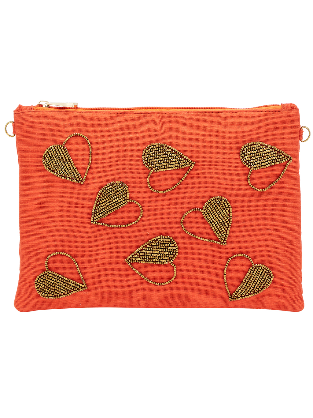 Τσάντα φάκελος με φερμουάρ και αλυσίδα χειροποίητος (25χ18 cm) με καρδιές, κεντημένο στο χέρι με χάνδρες ,σε χρώμα πορτοκαλί