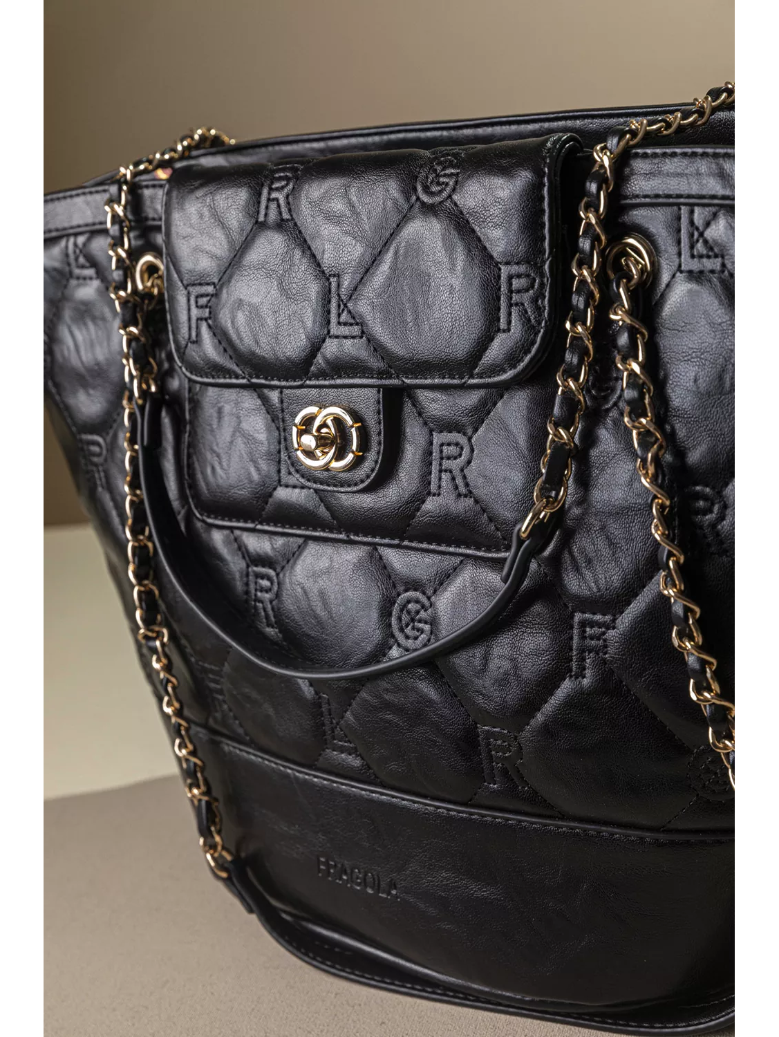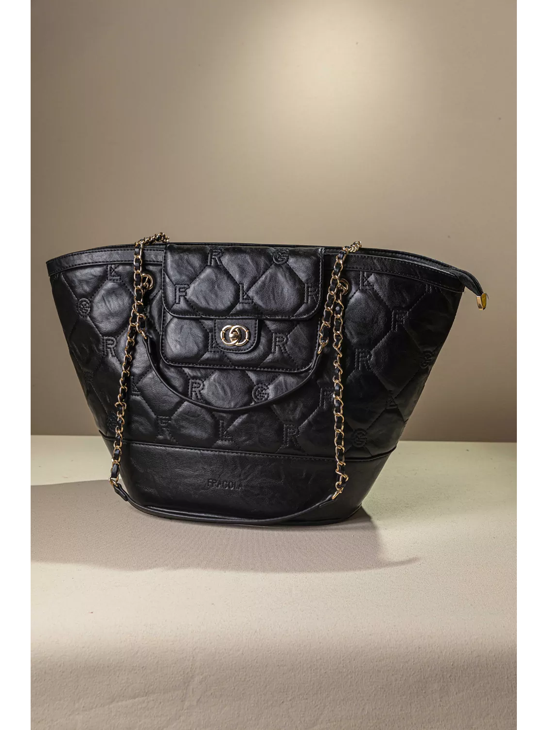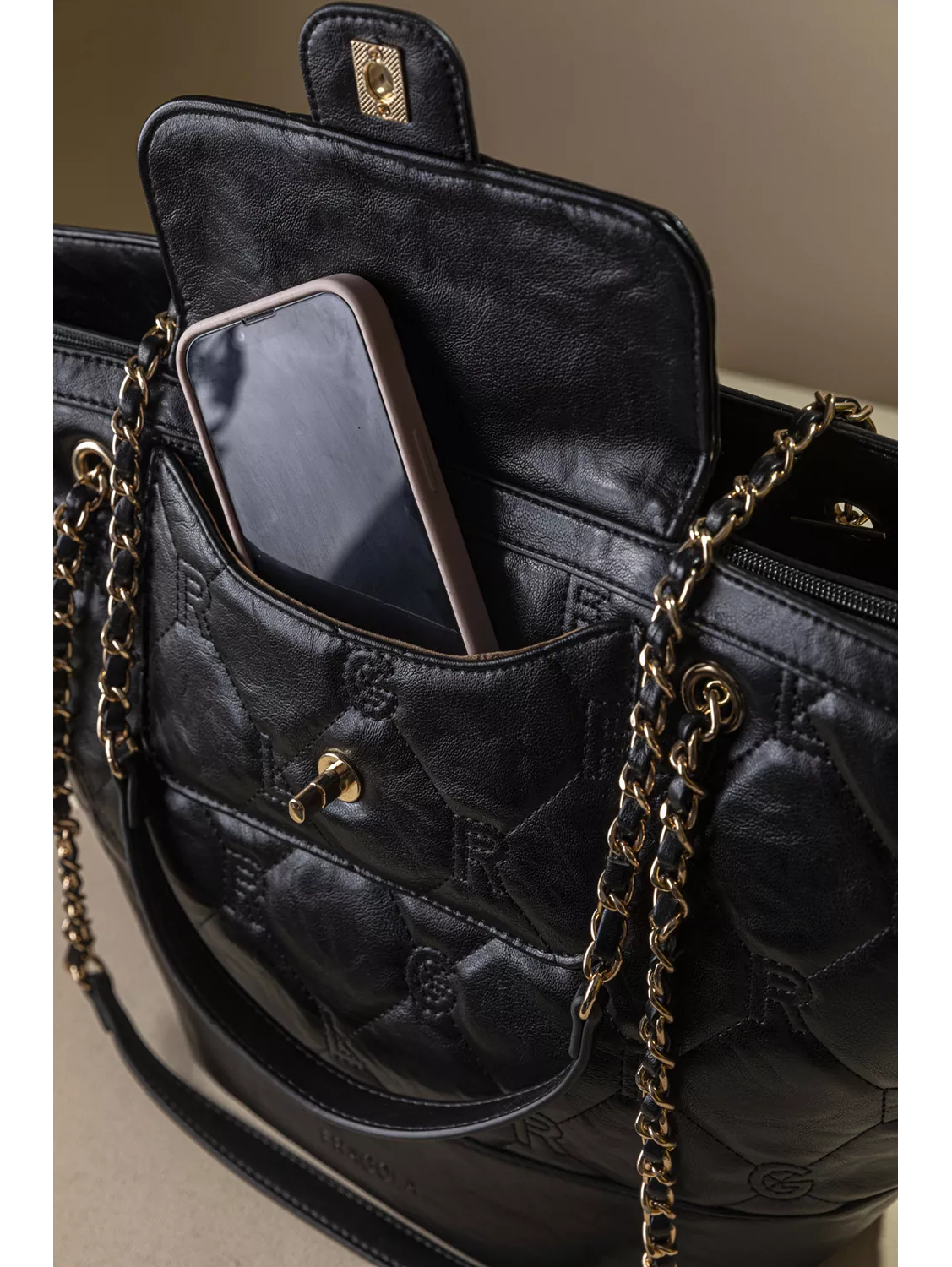 • Καπιτονέ σχέδιο με γαζιά που απεικονίζει τα γράμματα της εταιρείας. Χρυσές μεταλλικές λεπτομέρειες που χαρίζουν πολυτελή εμφάνιση.