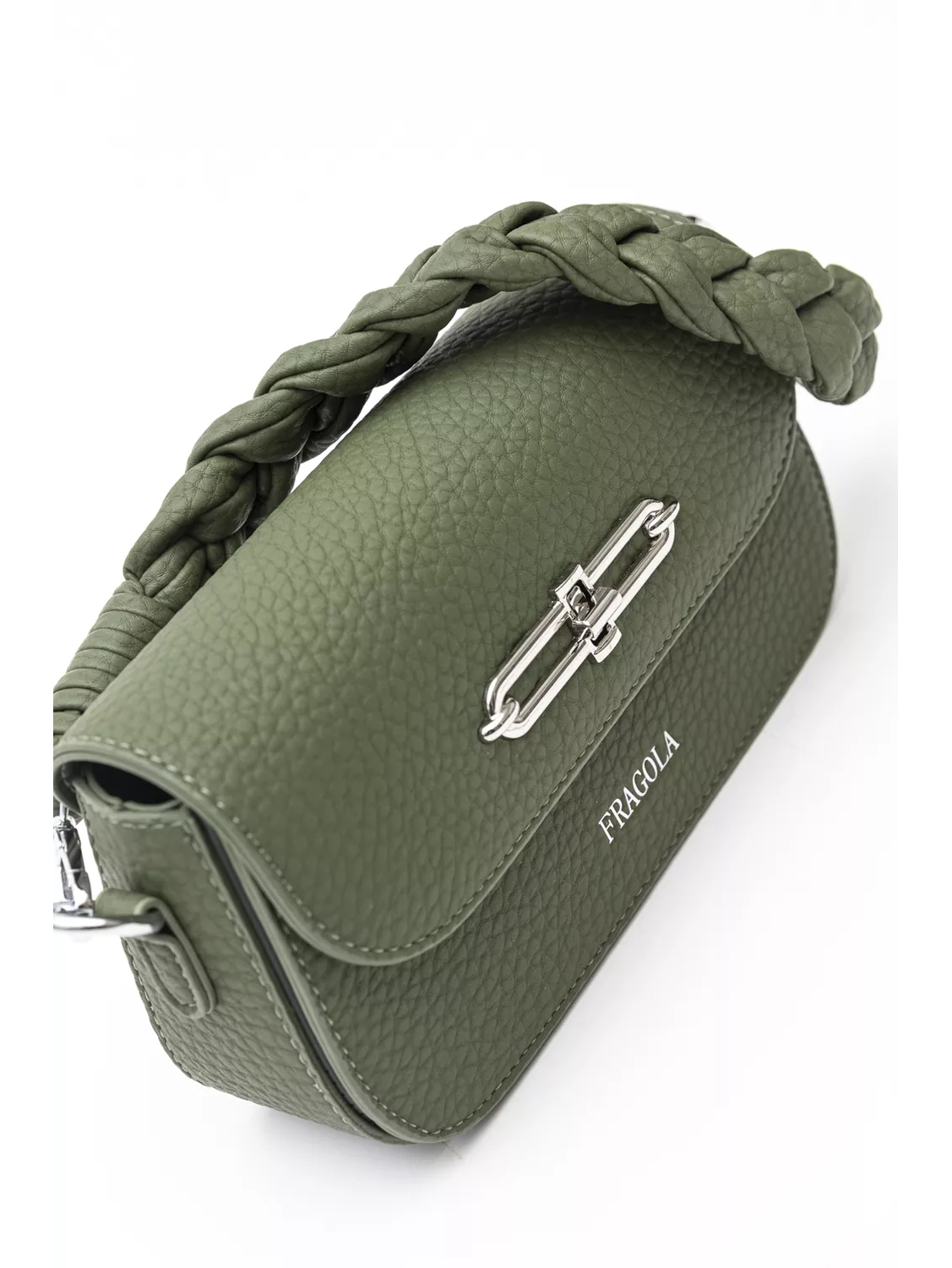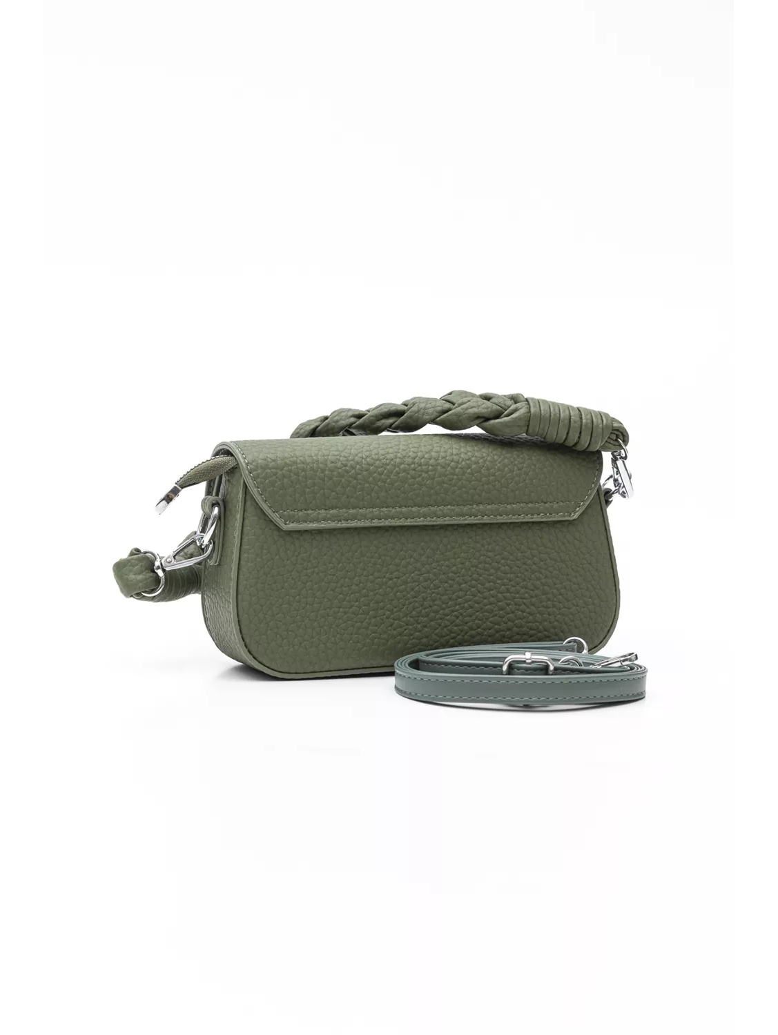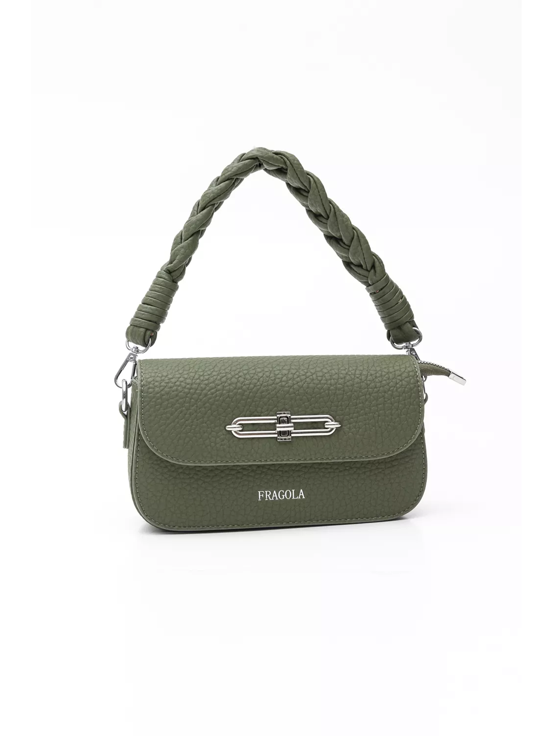 Σταθερή τσάντα ώμου με καπάκι με μεταλλική κλειδαριά. Έχει κοντό, μαλακό χέρι για τον ώμο και μακρύ αυξομειούμενο χέρι για να μετατραπεί σε χιαστί. Η κεντρική της θέση κλείνει με φερμουάρ και μέσα θα βρείτε το κλασικό τσεπάκι με το φερμουάρ αλλά και όλα τα κλασικά τσεπάκια για τα μικροαντικείμενα σας. Κάτω από το καπάλη έχει δεύτερη μεγάλη θέση με φυσούνα. Υλικό: Ανάγλυφο οικολογικό δέρμα.