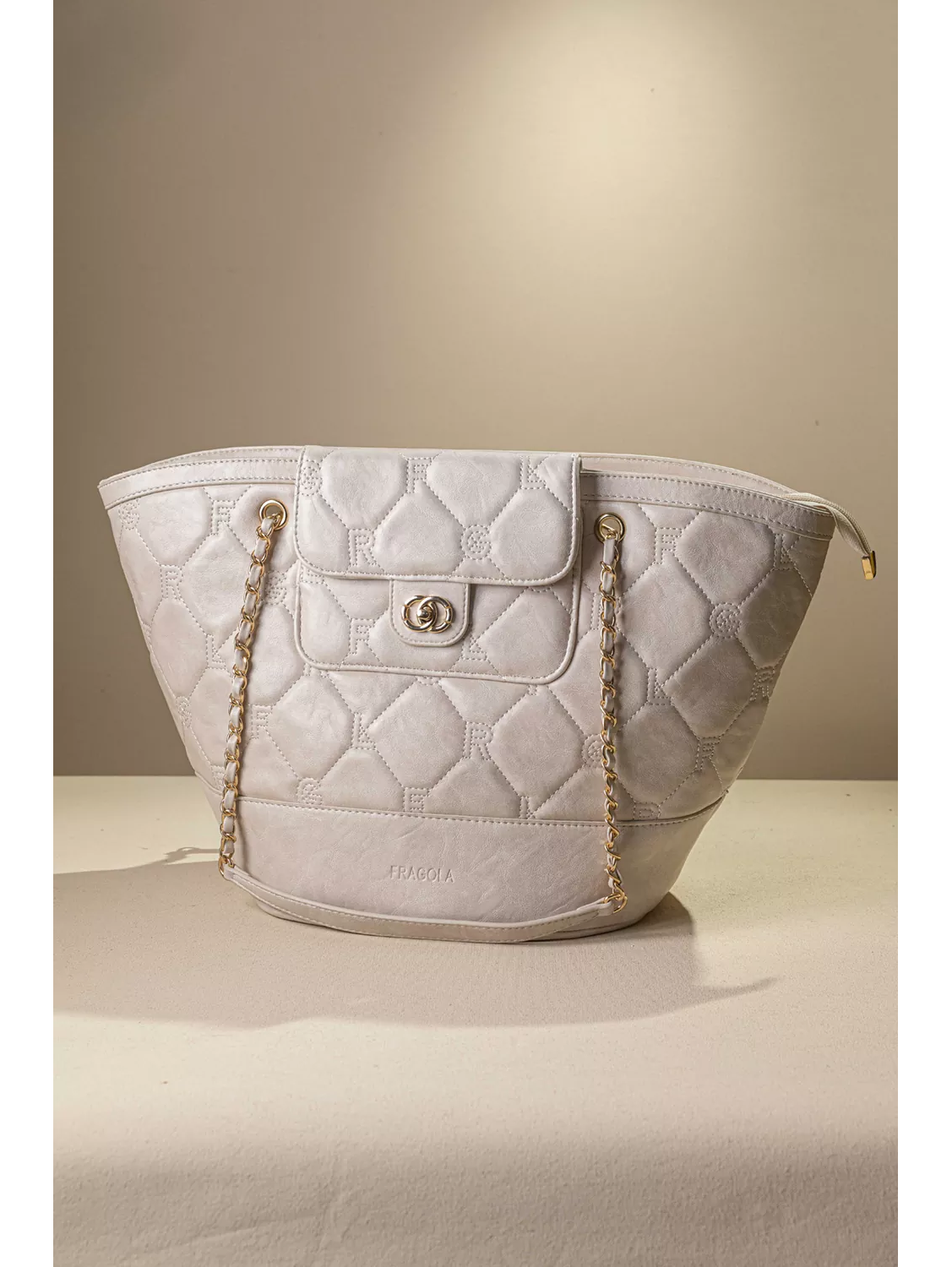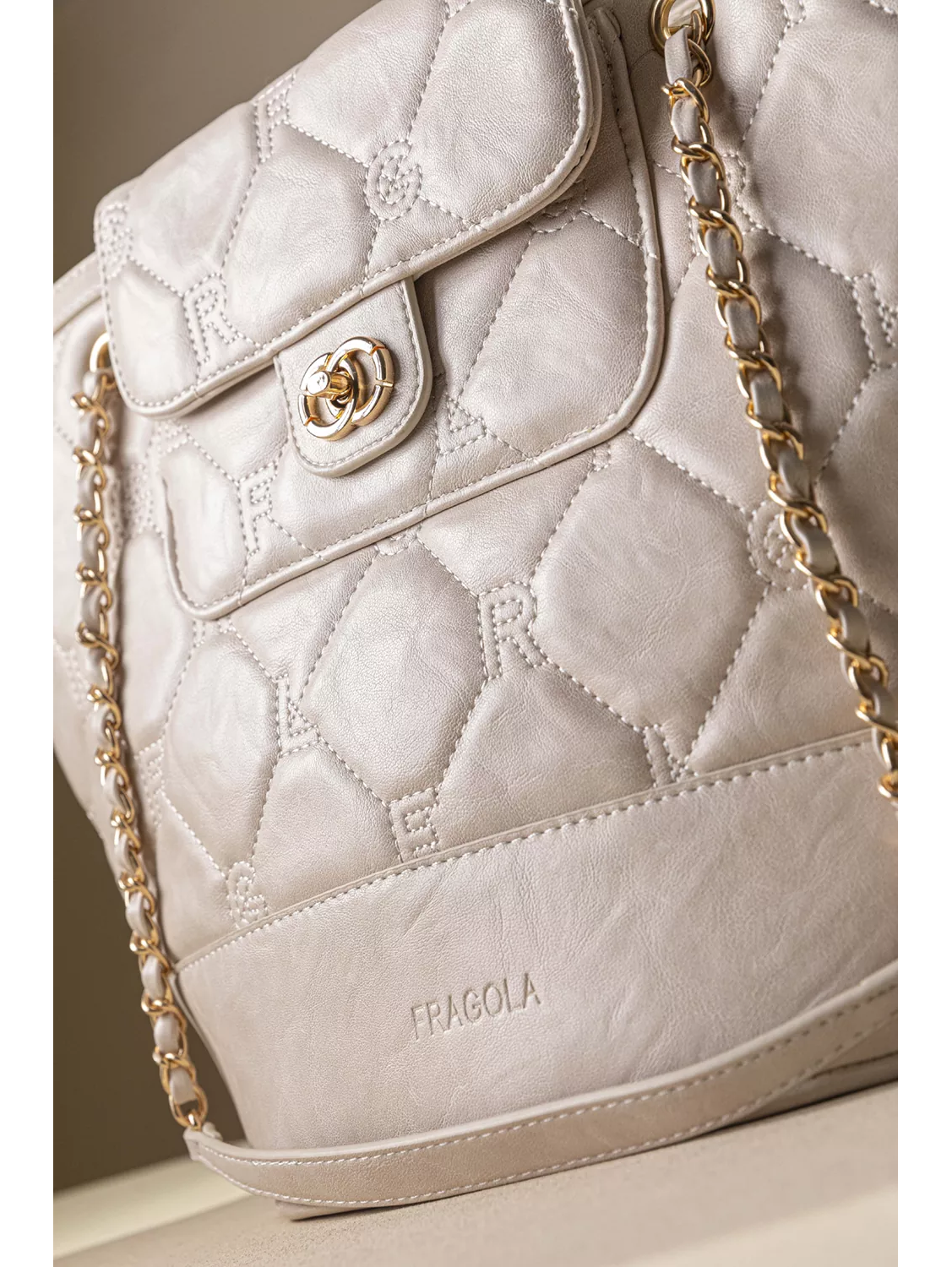 • Καπιτονέ σχέδιο με γαζιά που απεικονίζει τα γράμματα της εταιρείας. Χρυσές μεταλλικές λεπτομέρειες που χαρίζουν πολυτελή εμφάνιση.