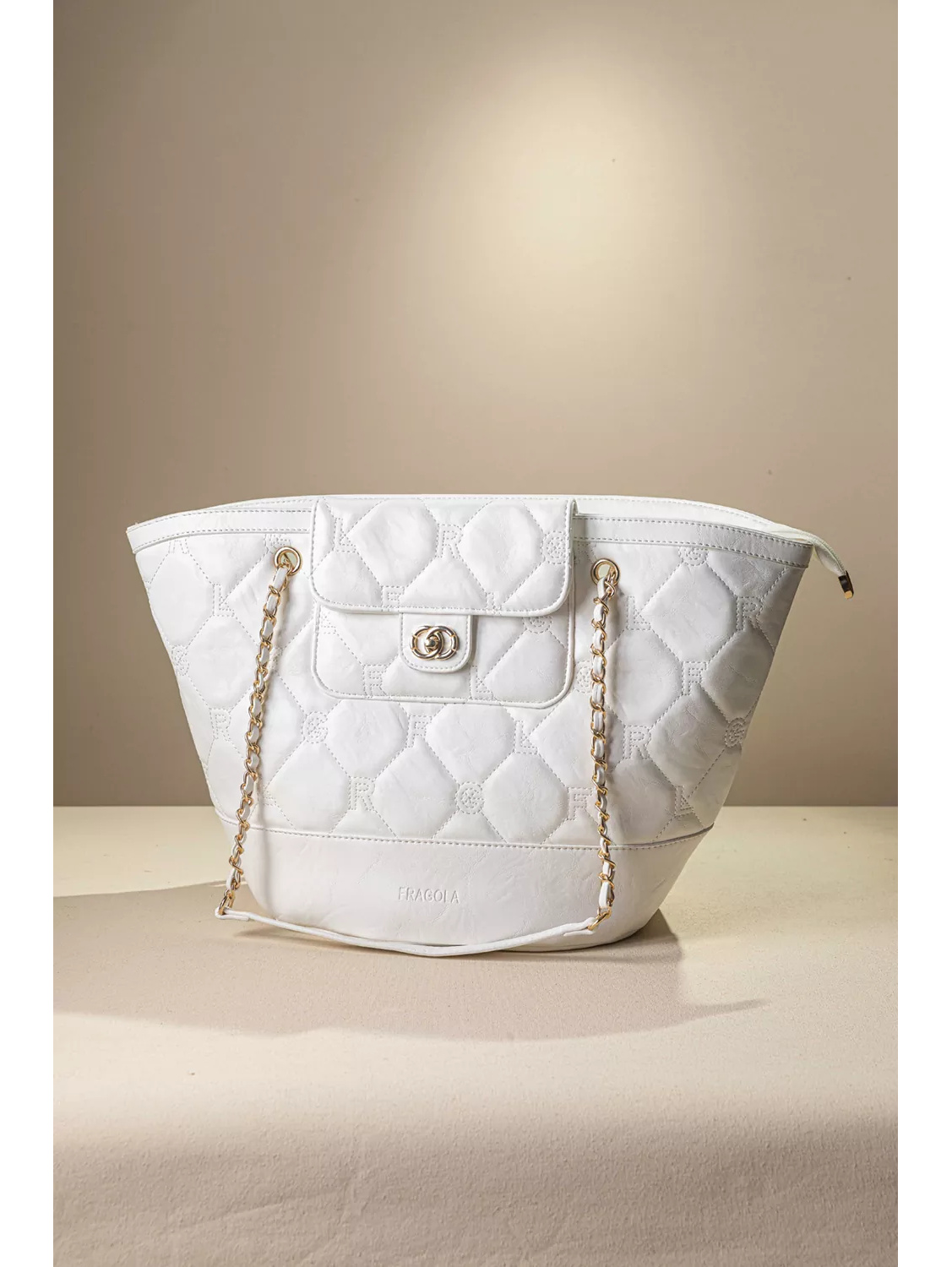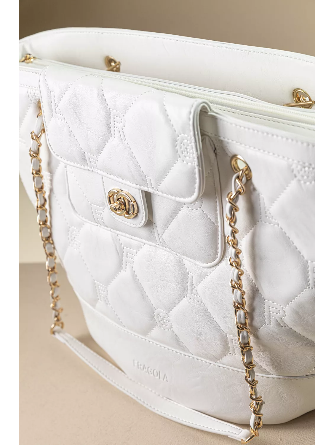 • Shopper τσάντα ώμου κατασκευασμένη από μαλακό συνθετικό δέρμα με παλαιωμένη όψη. • Καπιτονέ σχέδιο με γαζιά που απεικονίζει τα γράμματα της εταιρείας. Χρυσές μεταλλικές λεπτομέρειες που χαρίζουν πολυτελή εμφάνιση. • Τσεπάκι με καπάκι και μεταλλικό κούμπωμα στο μπροστινό μέρος. Οι διπλές αλυσίδες ώμου με επένδυση δέρματος προσφέρουν άνεση και σταθερό κράτημα. • Το ευρύχωρο εσωτερικό της είναι ιδανικό για καθημερινή χρήση απο το πρωί έως το βράδυ.