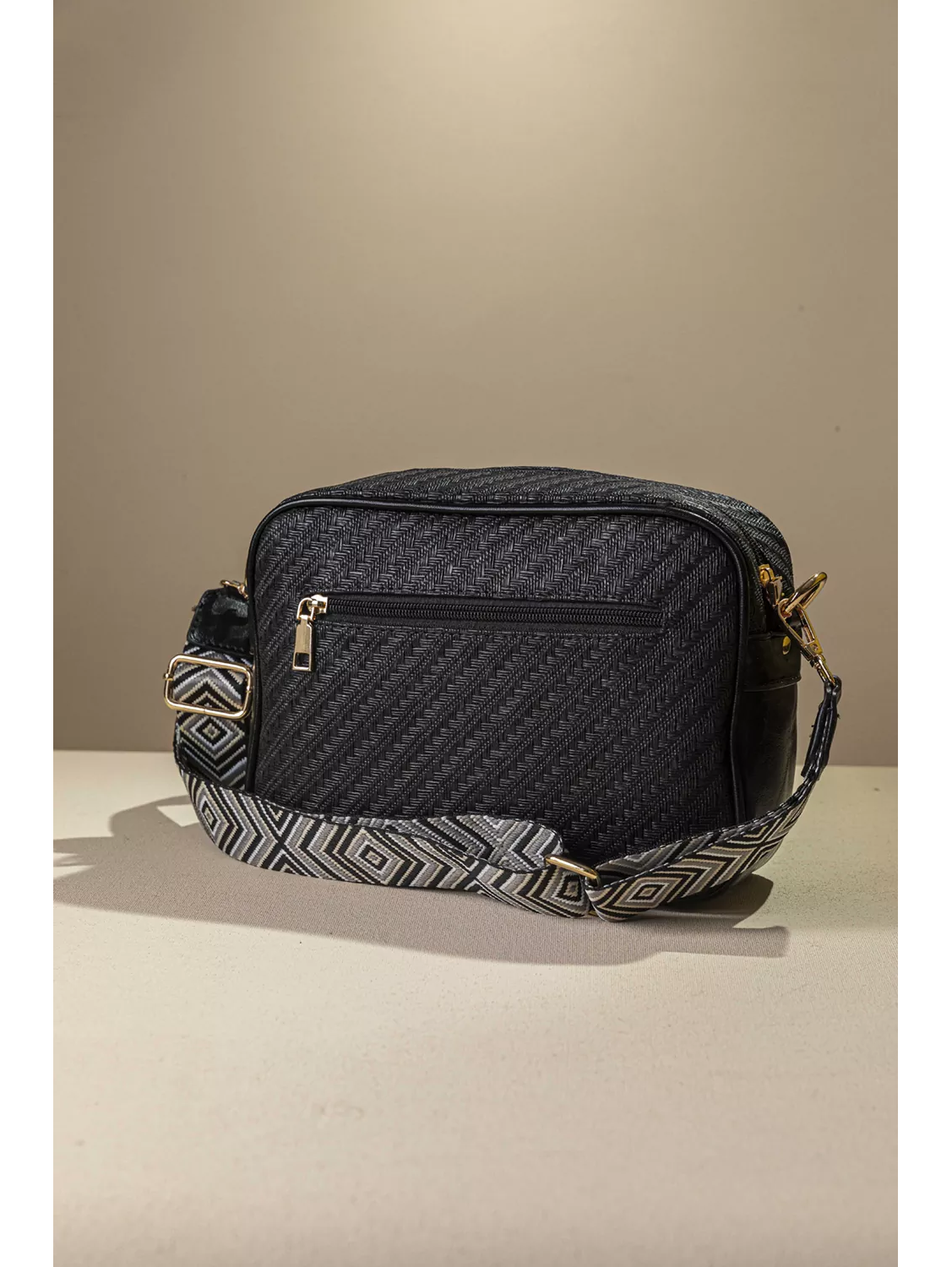 • Τσάντα χιαστί με αυξομειούμενο ιμάντα. Τσέπη με καπάκι στο μπροστινό μέρος και η κλασική βοηθητική τσέπη στο πίσω μέρος με το φερμουάρ. • Ενιαίος εσωτερικός χώρος με τα βοηθητικά τσεπάκια στο εσωτερικό του. Υλικό: Συνθετικό δέρμα με υφή ψάθας σε γήινες αποχρώσεις