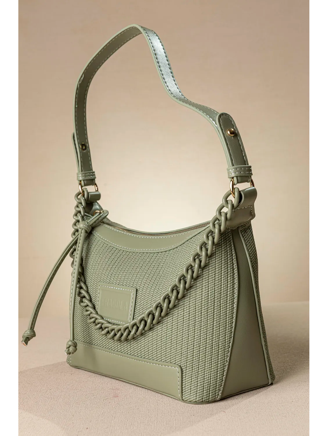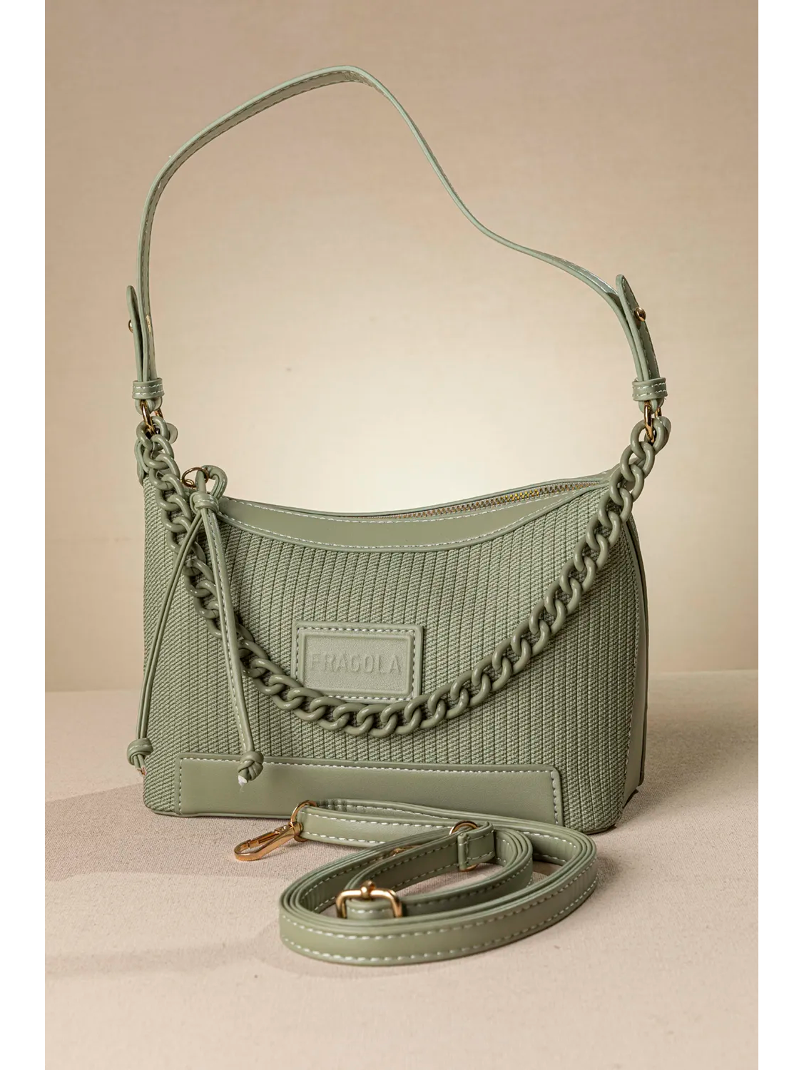 Τσαντάκι ώμου κατάλληλη για όλες τις ώρες της ημέρας αλλά και για όλες τις ηλικίες. Μια βαμμένη αλυσίδα στο μπροστινό της μέρος της δίνει έξτρα στιλ! Ένας ενιαίος χώρος που κλείνει με φερμουάρ και στο εσωτερικό της διαθέτει μια μικρή τσέπη με φερμουάρ. Επίσης διαθέτει έξτρα "χεράκι" για να μετατραπεί η τσάντα σε χιαστί.Υλικό: Συνθετικό δέρμα με υφή υφάσματος.