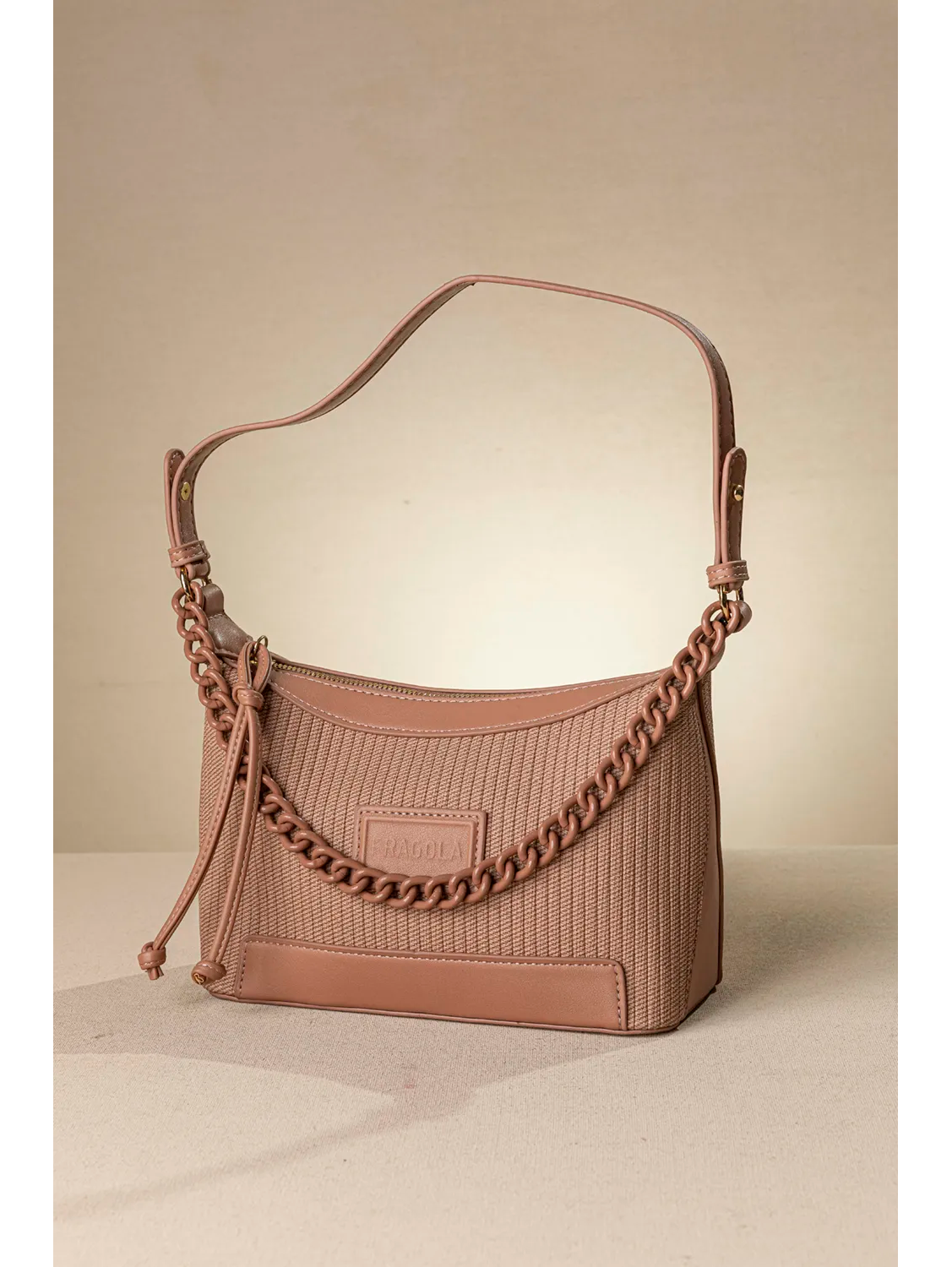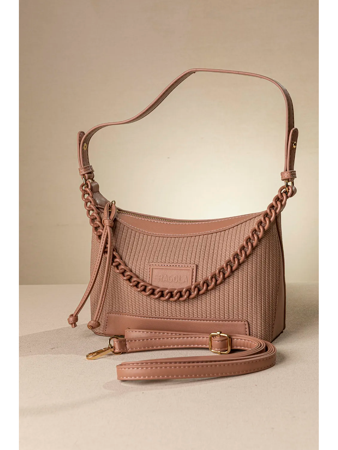 Τσαντάκι ώμου κατάλληλη για όλες τις ώρες της ημέρας αλλά και για όλες τις ηλικίες. Μια βαμμένη αλυσίδα στο μπροστινό της μέρος της δίνει έξτρα στιλ! Ένας ενιαίος χώρος που κλείνει με φερμουάρ και στο εσωτερικό της διαθέτει μια μικρή τσέπη με φερμουάρ. Επίσης διαθέτει έξτρα "χεράκι" για να μετατραπεί η τσάντα σε χιαστί.Υλικό: Συνθετικό δέρμα με υφή υφάσματος.