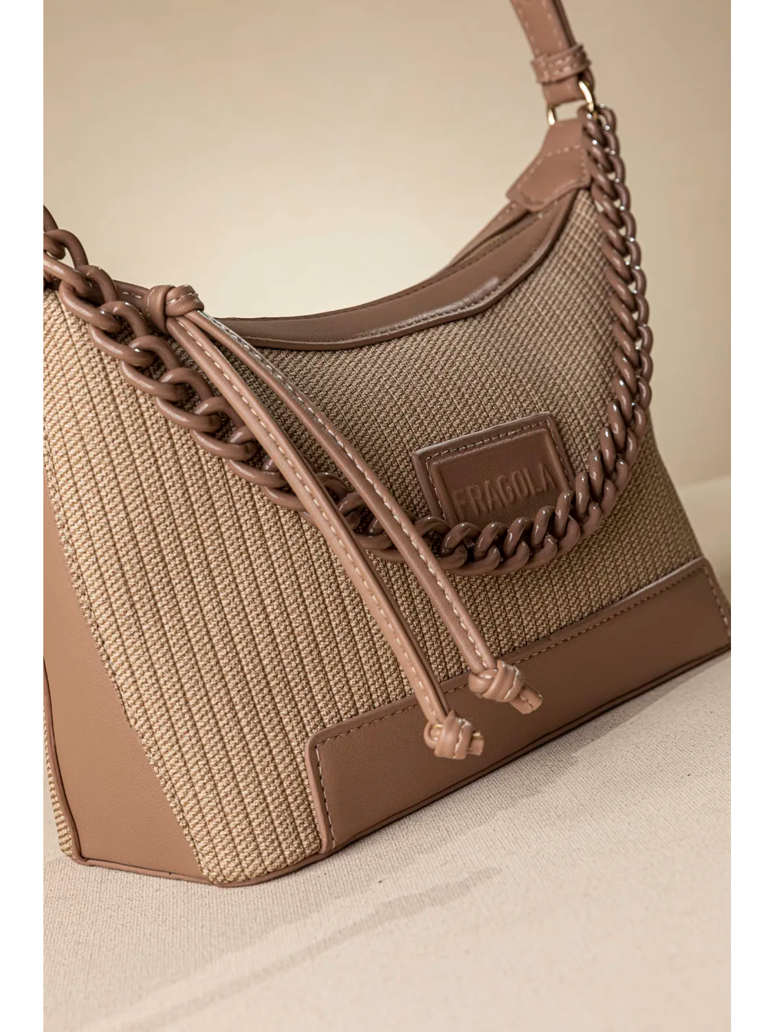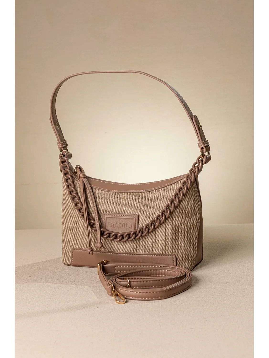 Τσαντάκι ώμου κατάλληλη για όλες τις ώρες της ημέρας αλλά και για όλες τις ηλικίες. Μια βαμμένη αλυσίδα στο μπροστινό της μέρος της δίνει έξτρα στιλ! Ένας ενιαίος χώρος που κλείνει με φερμουάρ και στο εσωτερικό της διαθέτει μια μικρή τσέπη με φερμουάρ. Επίσης διαθέτει έξτρα "χεράκι" για να μετατραπεί η τσάντα σε χιαστί.Υλικό: Συνθετικό δέρμα με υφή υφάσματος.