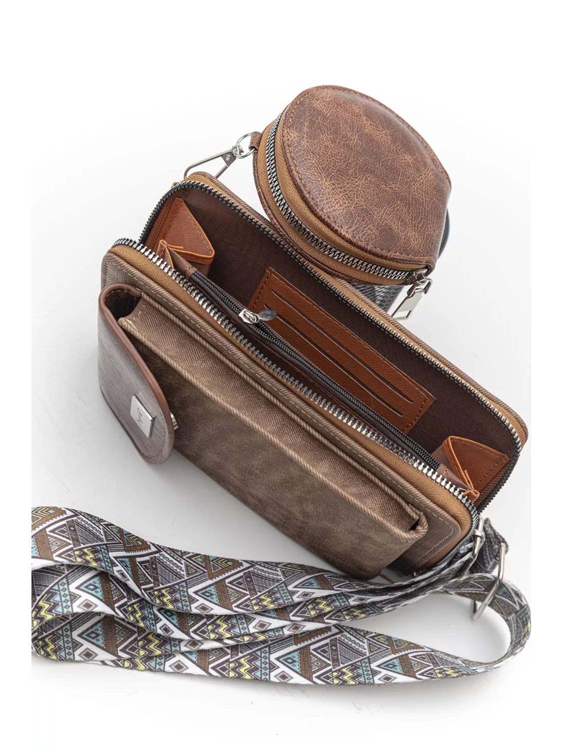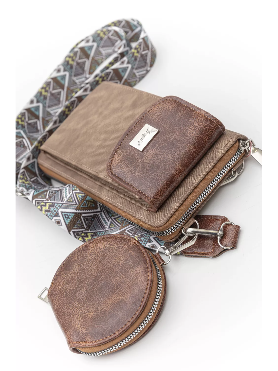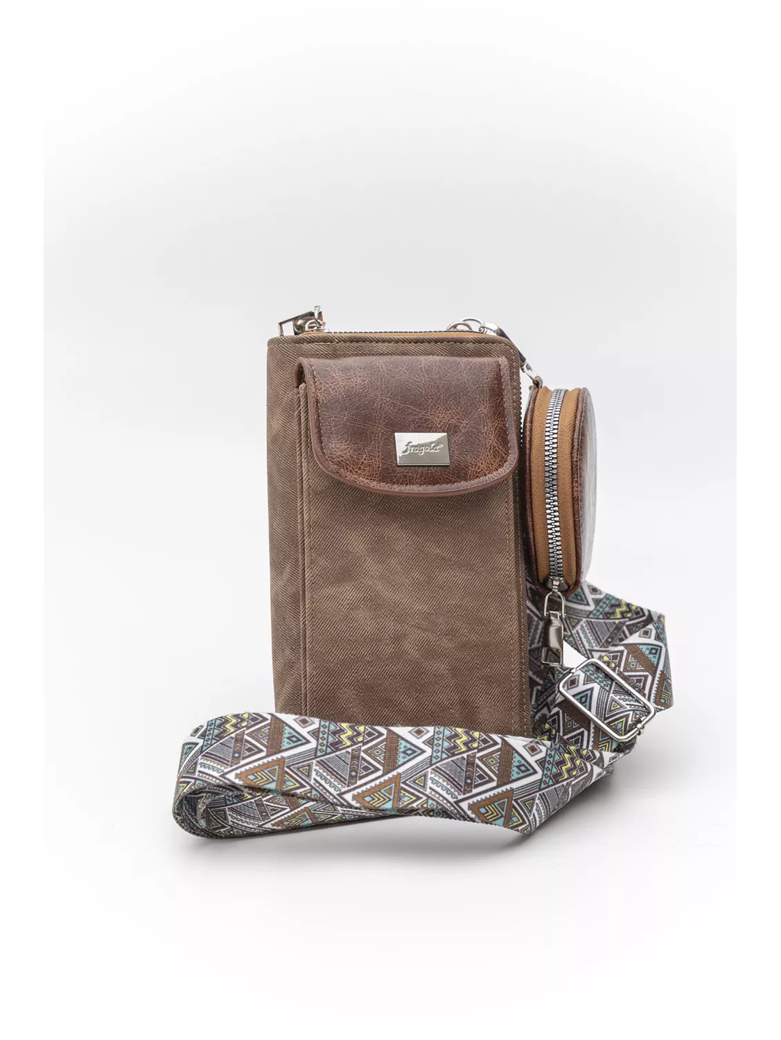 Χιαστί τσαντάκι δύο όψεων (κινητό-πορτοφόλι). Η μια όψη είναι θέση κινητού με καπάκι. Η δεύτερη όψη είναι πορτοφόλι με όλους τους απαραίτητους χρηστικούς χώρους . Συμπεριλαμβάνει έξτρα στρόγγυλη θήκη με φερμουάρ για usb, ακουστικά κλπ.
