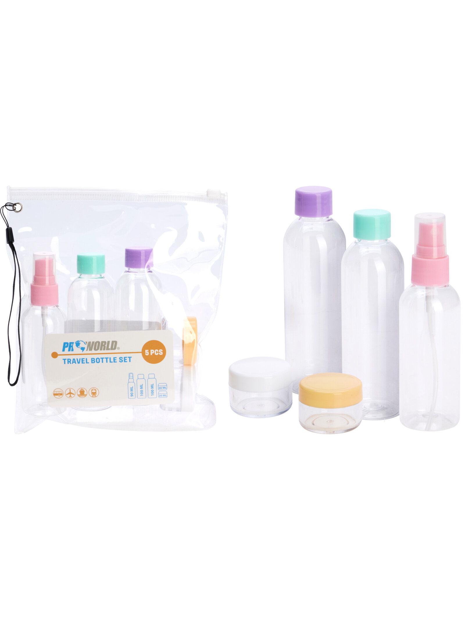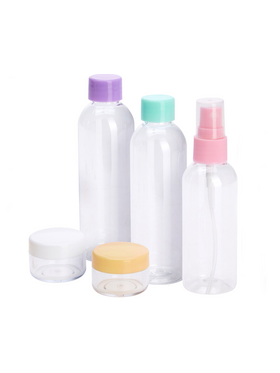 Σετ ταξιδίου 6τμχ σε διάφανο νεσεσέρ με μπουκαλάκια και βαζάκια διάφανα με χρωματιστά καπάκια