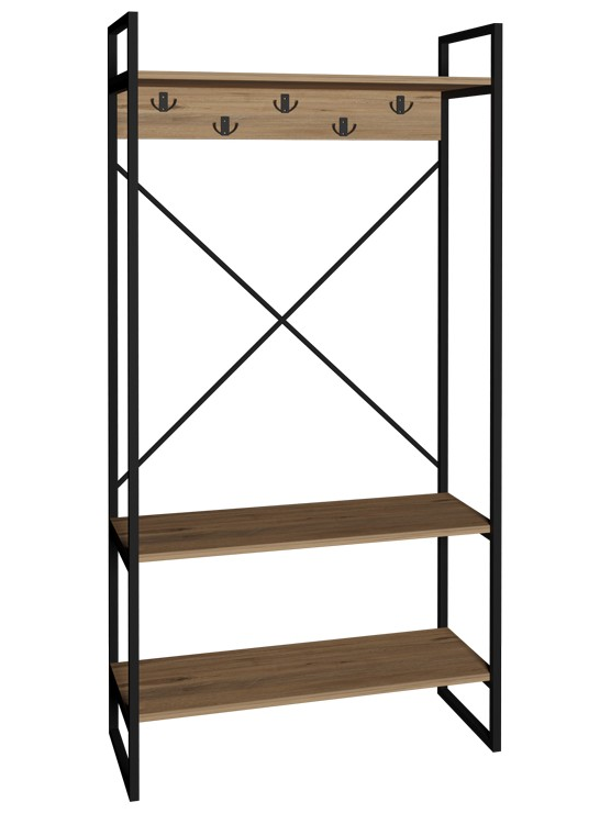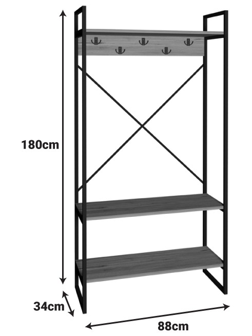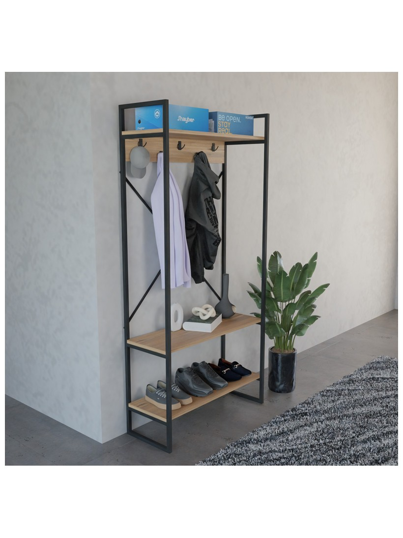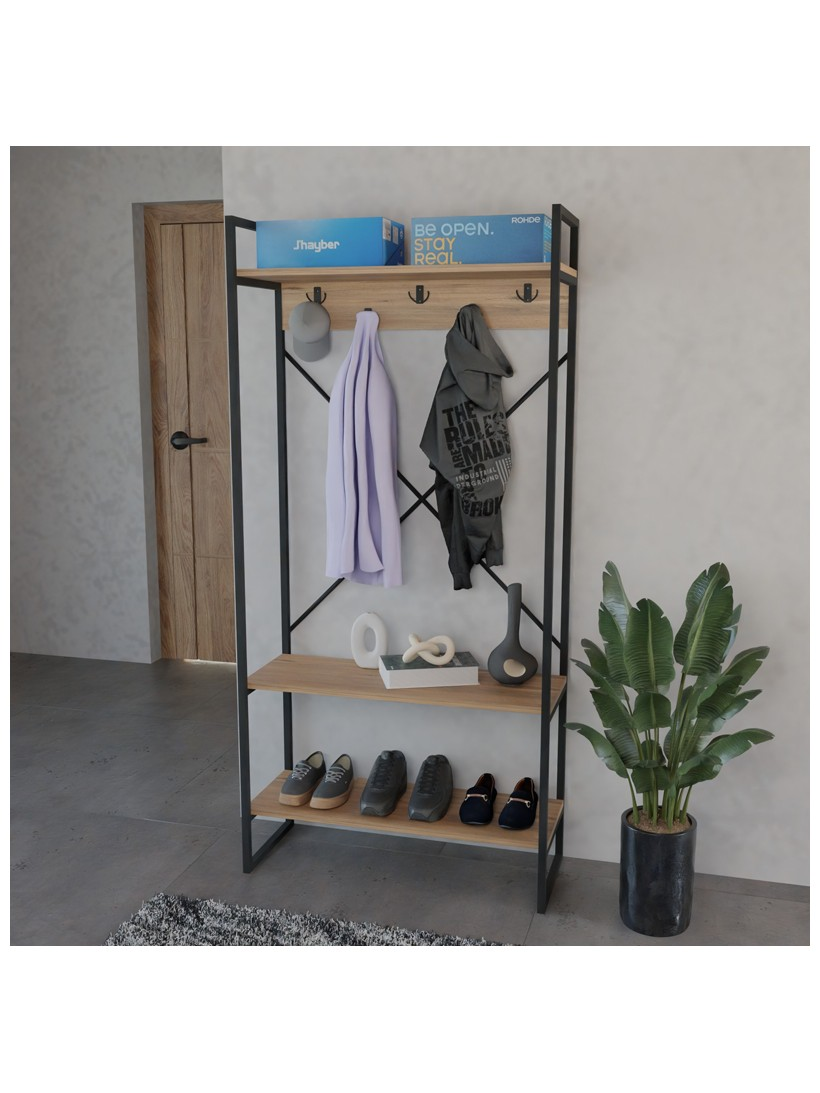 Σχεδιασμένο για να καλύπτει όλες τις καθημερινές σας ανάγκες, το έπιπλο αυτό προσφέρει μια ολοκληρωμένη λύση αποθήκευσης. Κρεμάστε άνετα τα παλτό, τα κασκόλ και τις τσάντες σας στους ενσωματωμένους γάντζους, τοποθετήστε τα παπούτσια σας τακτοποιημένα στο κάτω ράφι και χρησιμοποιήστε τα πάνω ράφια για να προσθέσετε την προσωπική σας πινελιά με διακοσμητικά αντικείμενα ή βιβλία.