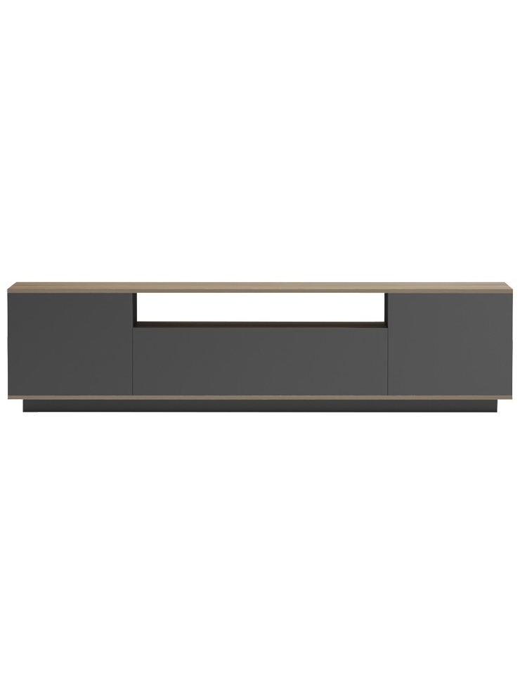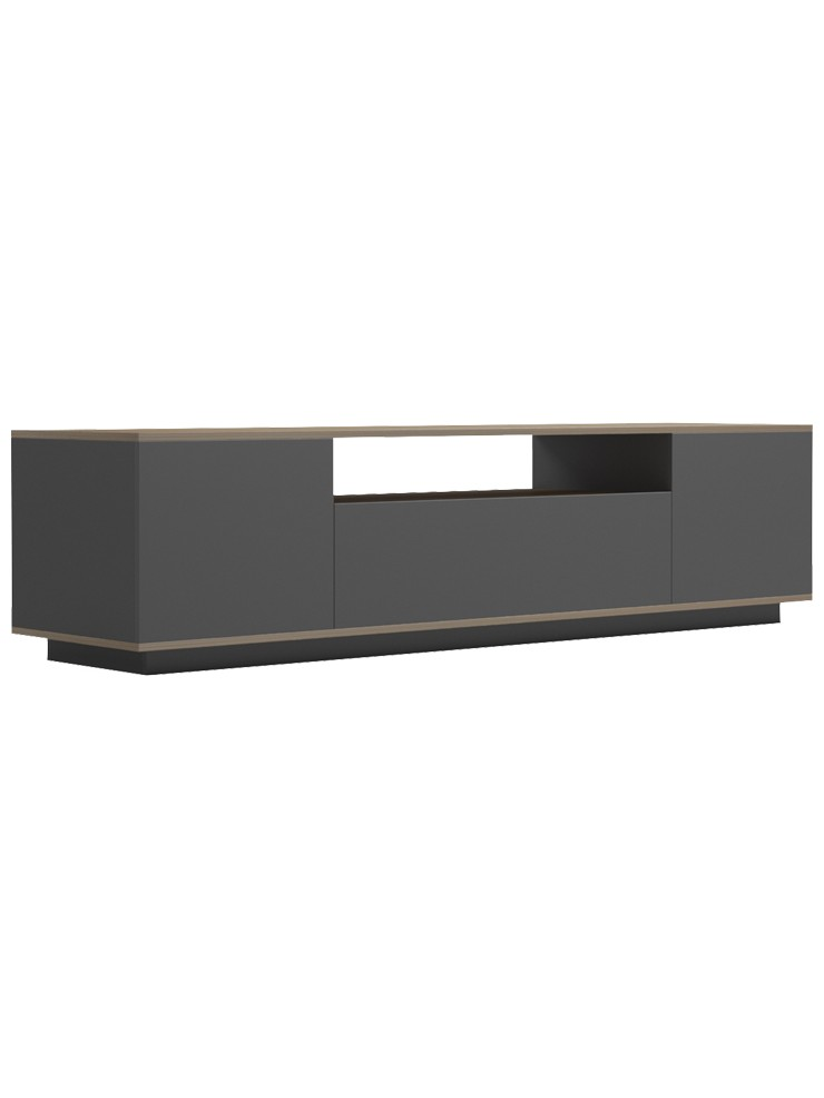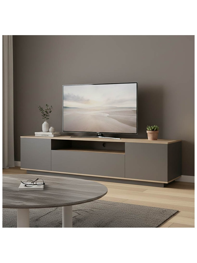 Αναβαθμίστε την ψυχαγωγική σας γωνιά με αυτό το σύγχρονο και ευέλικτο έπιπλο τηλεόρασης, σχεδιασμένο για να προσφέρει τόσο στυλ όσο και άφθονο αποθηκευτικό χώρο. Ο συνδυασμός του γκρι φινιρίσματος με τη ζεστή απόχρωση του ξύλου δημιουργεί μια αισθητική που ταιριάζει άψογα σε μοντέρνους και μινιμαλιστικούς χώρους.